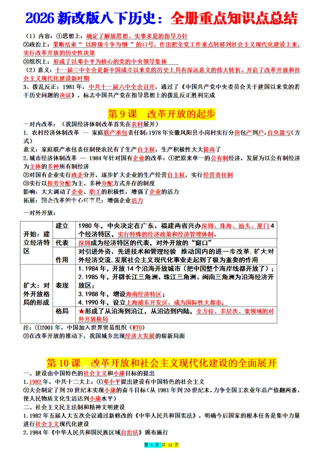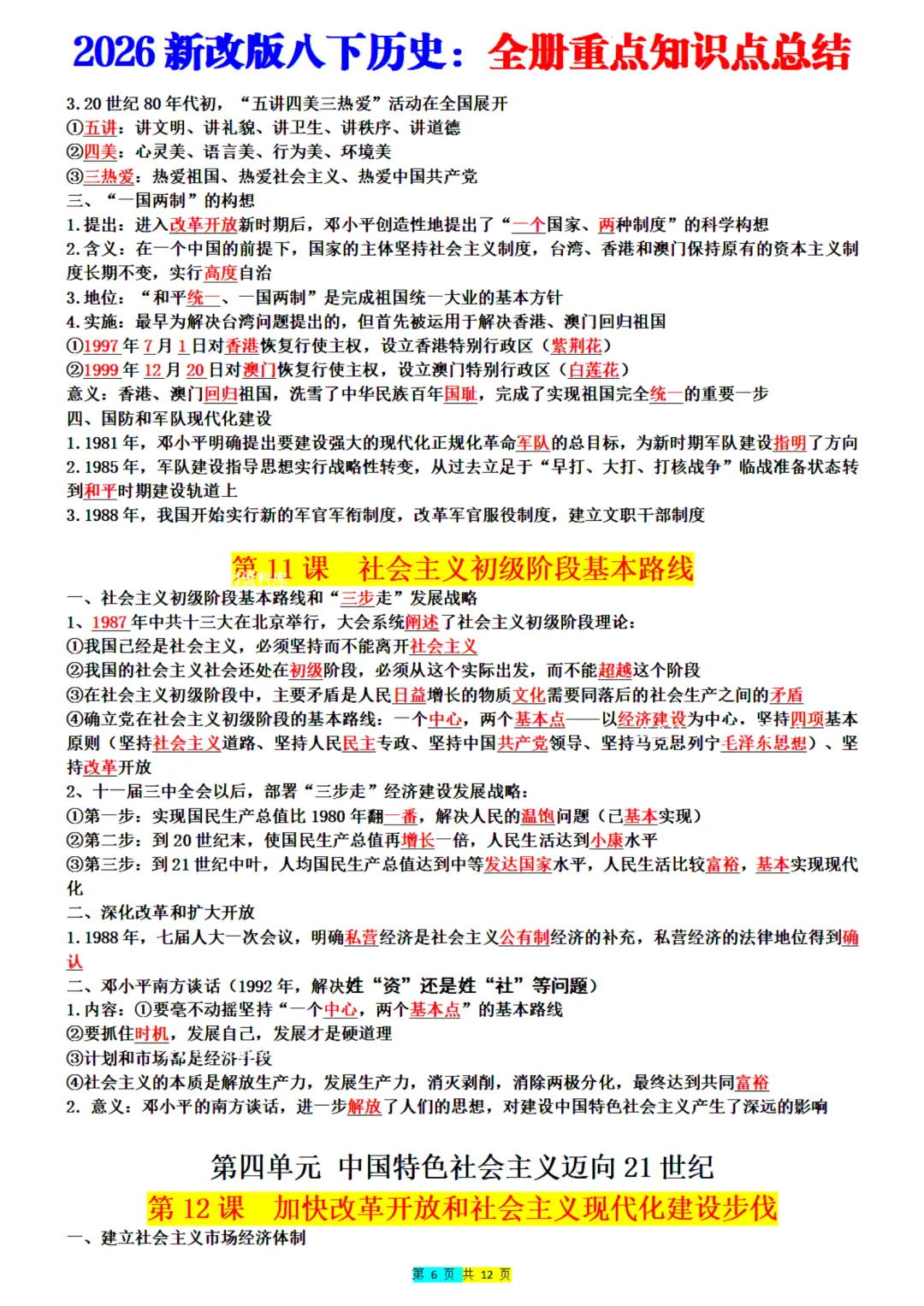 2026年最新版八年级下册历史全册重点知识点总结,老师整理了完整电子版,可打印,建议家长打印,学霸人手一份!