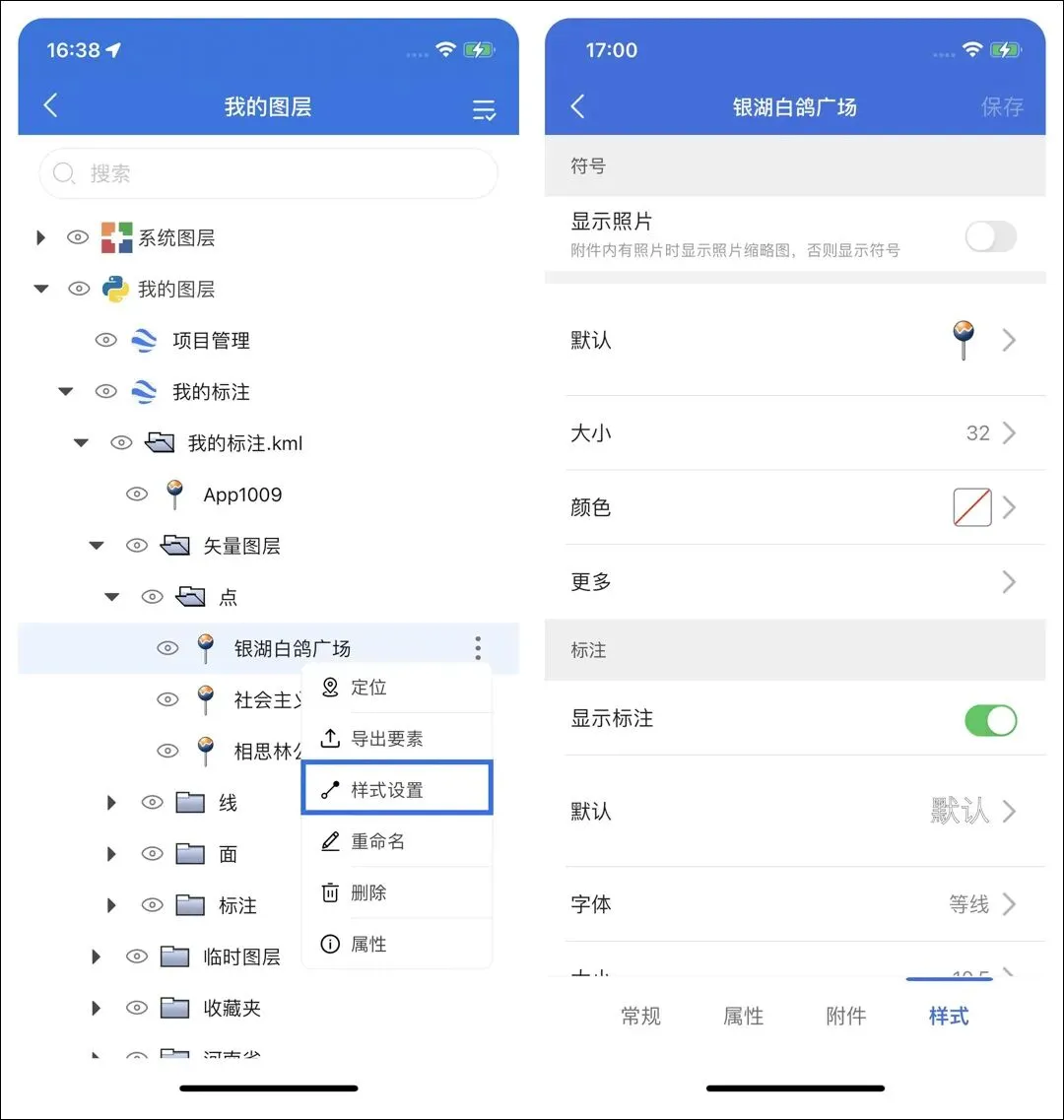 点击要素菜单按钮,点击【样式设置】跳转样式设置界面,样式界面提供符号、标注样式设置。