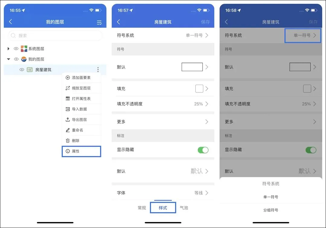 点击(点、线、面类型)图层菜单按钮,点击【属性】跳转图层属性界面,切换【样式】选项进入样式设置界面,样式界面提供符号、标注样式设置。