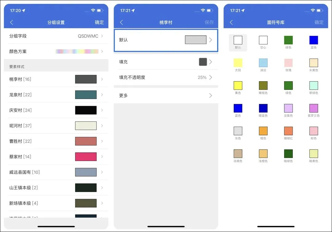 分组设置参数选择后,点击样式分组列表中图标可进入样式库设置,可单独设置分组后类别样式。点击一个分组选项,进入样式设置界面,可通过符号库直接选择,也可以点击【更多】选择颜色值设置填充与边线颜色。
