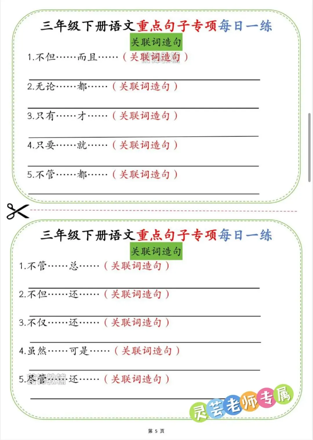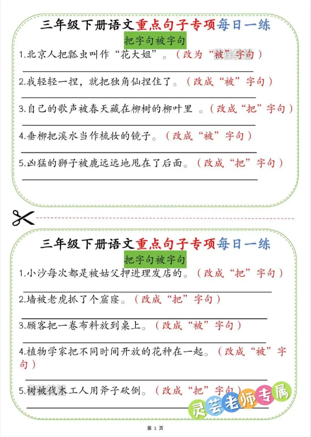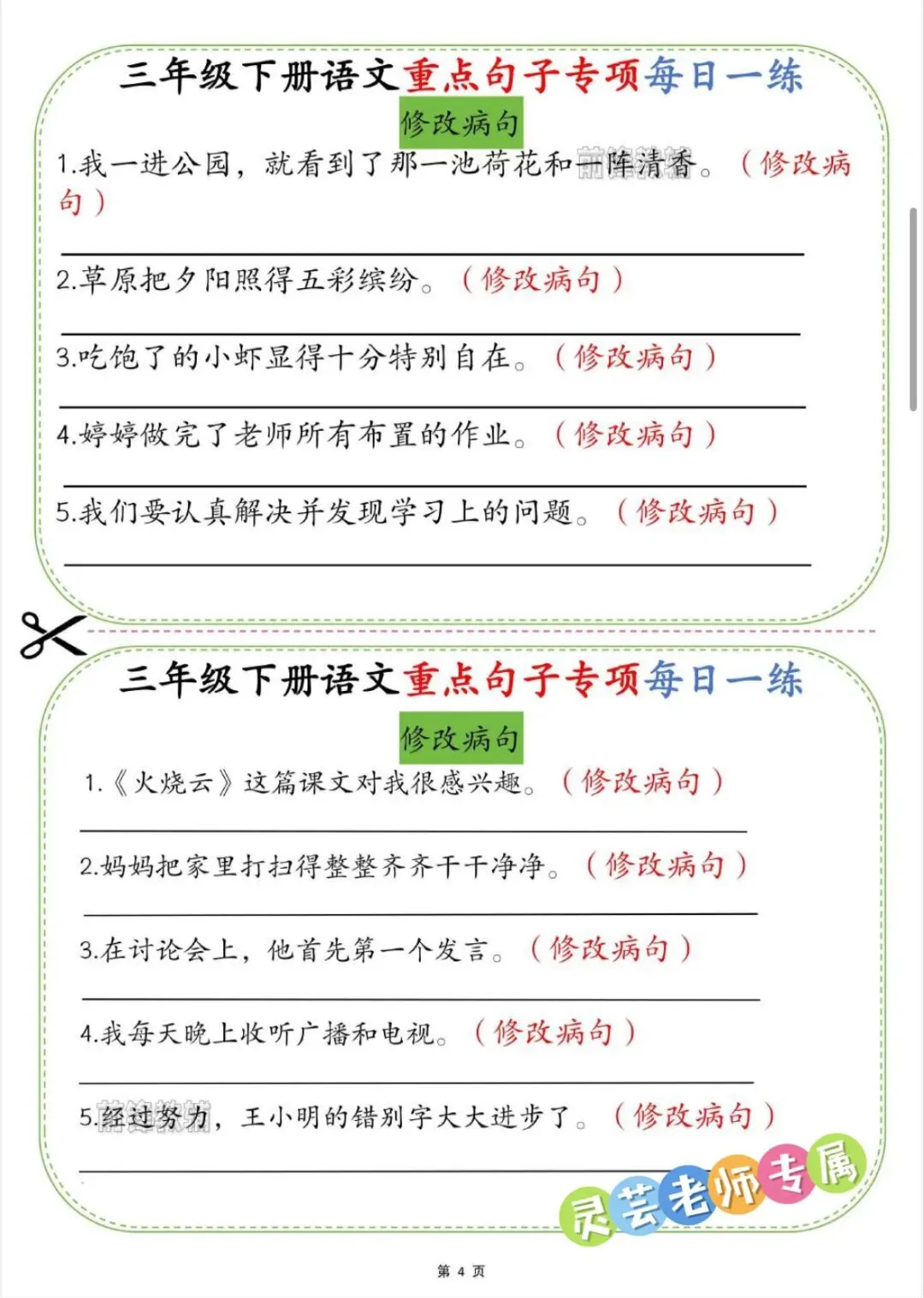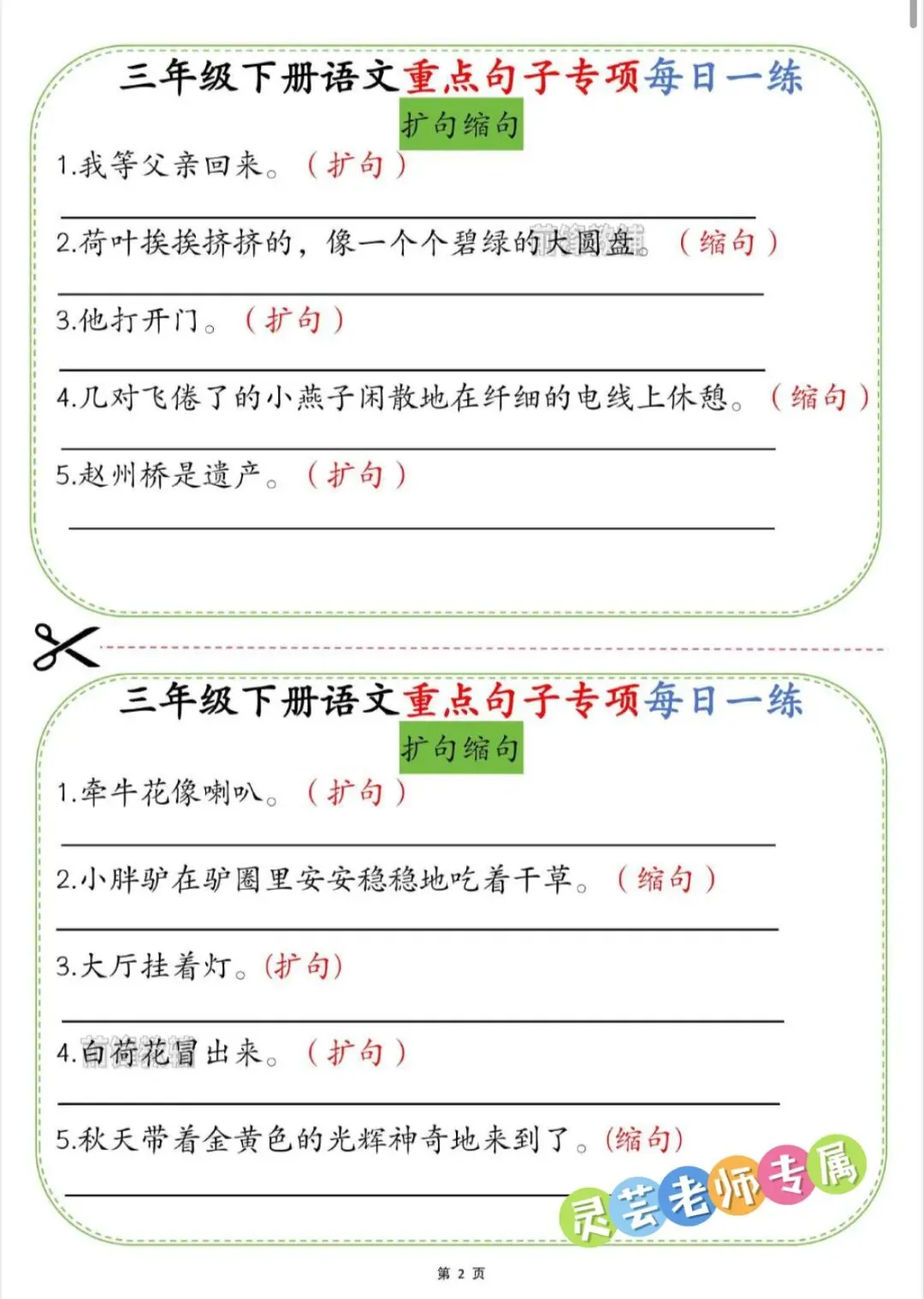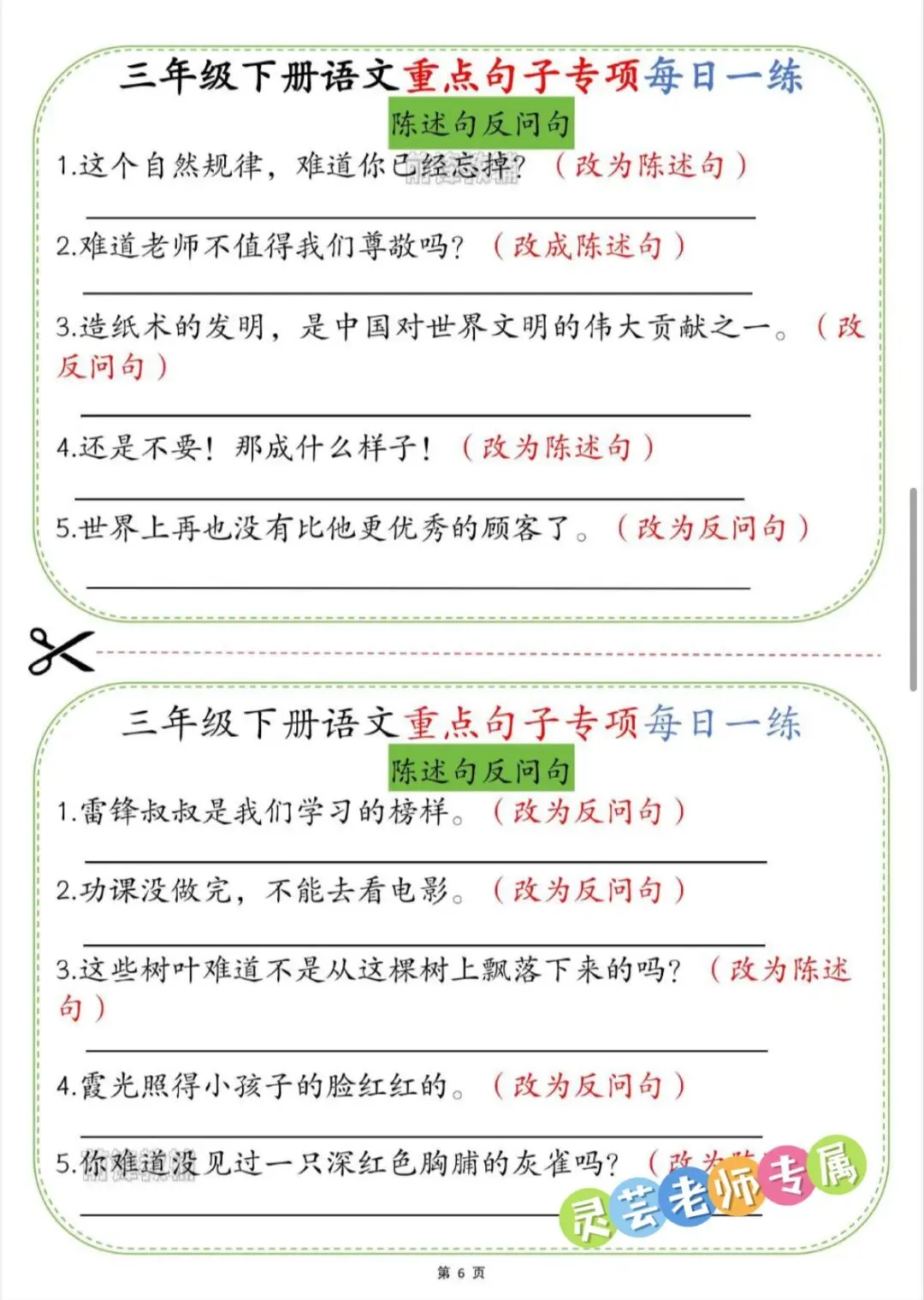 大家好!我是灵芸老师,今天分享的学习资料是:三年级下册语文重点句子专项每日一练(可打印,有答案),文末有电子版获取方式。需要的家长抓紧打印出来让孩子做一做、练一练。如果觉得这份资料不错,建议分享到班级群/年级群,让其他家长打印出来,帮助孩子学习。