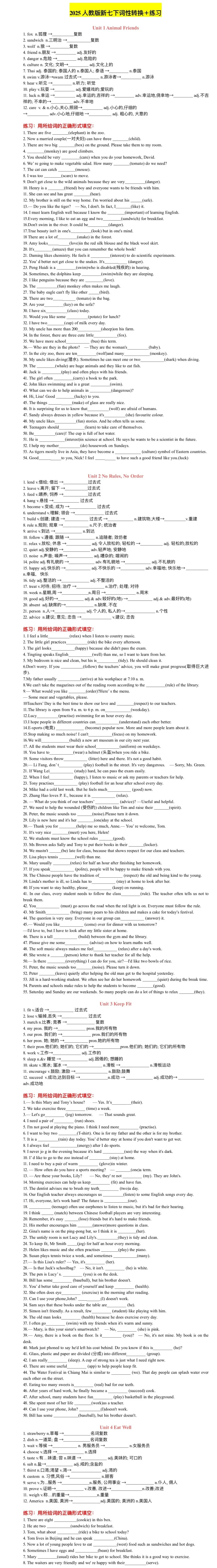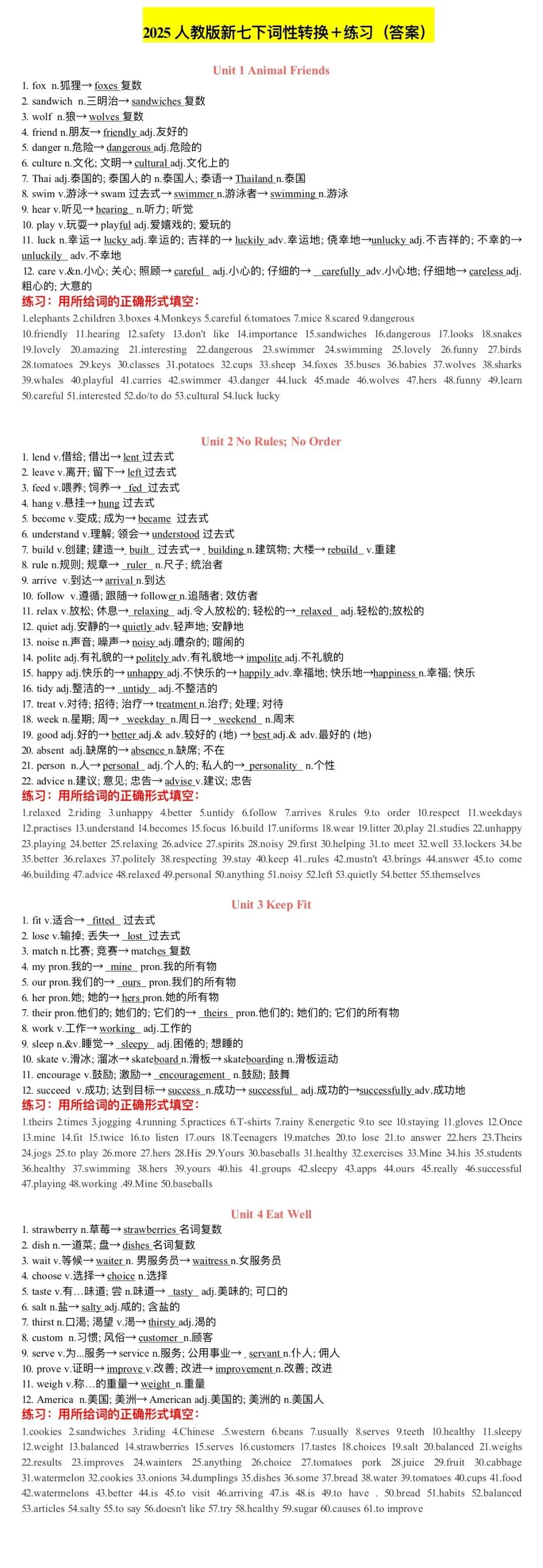 2026版七年级下册英语预习必备词性转换+练习(答案),可打印!