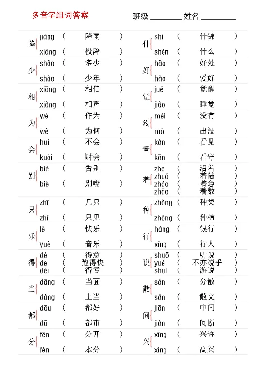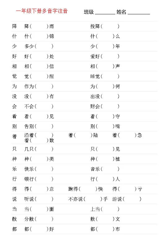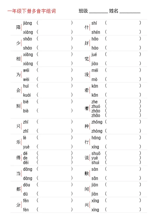 26春一年级下册多音字专项训练,电子版可打印