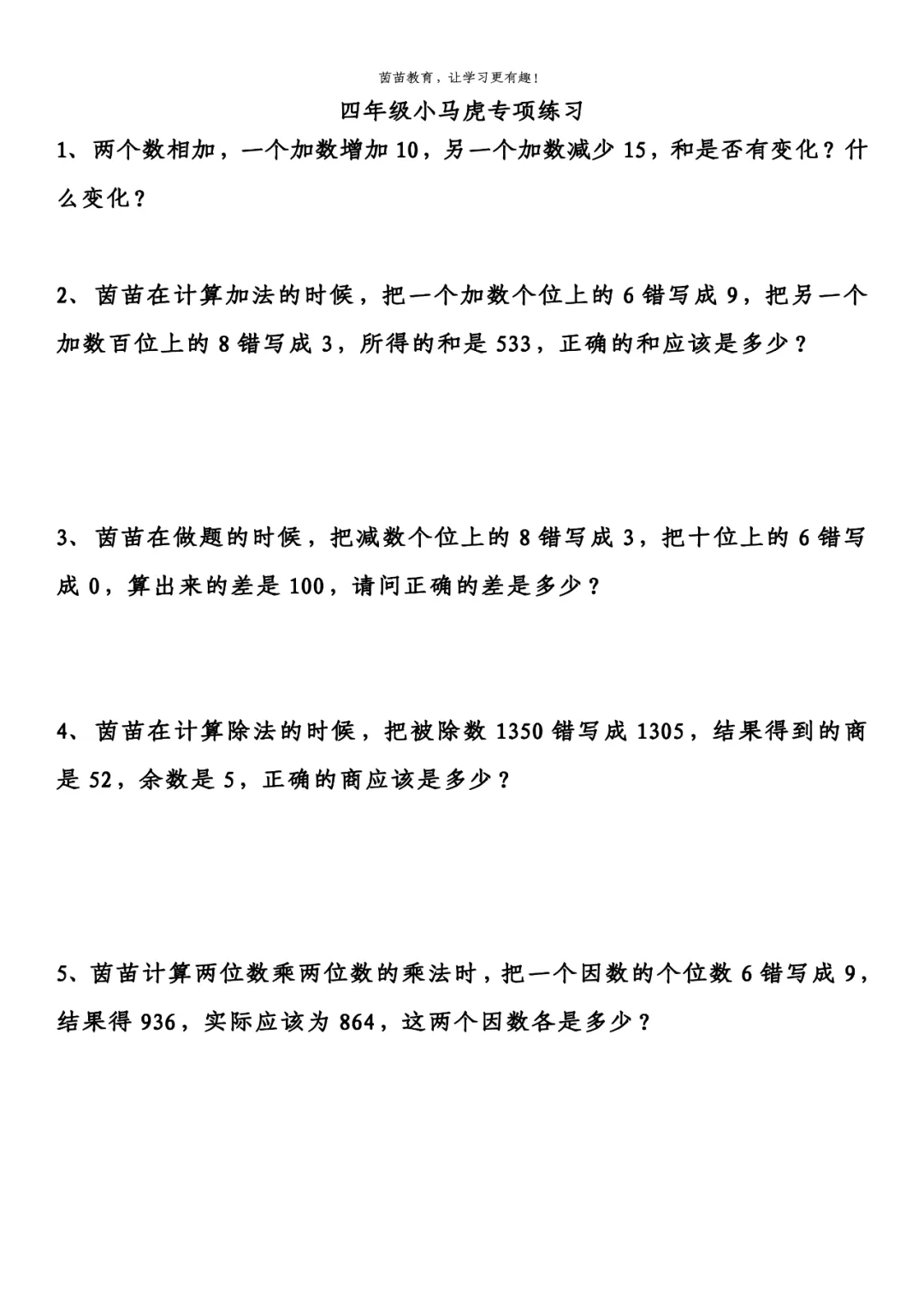 四年级上册数学小马虎应用题,可打印!