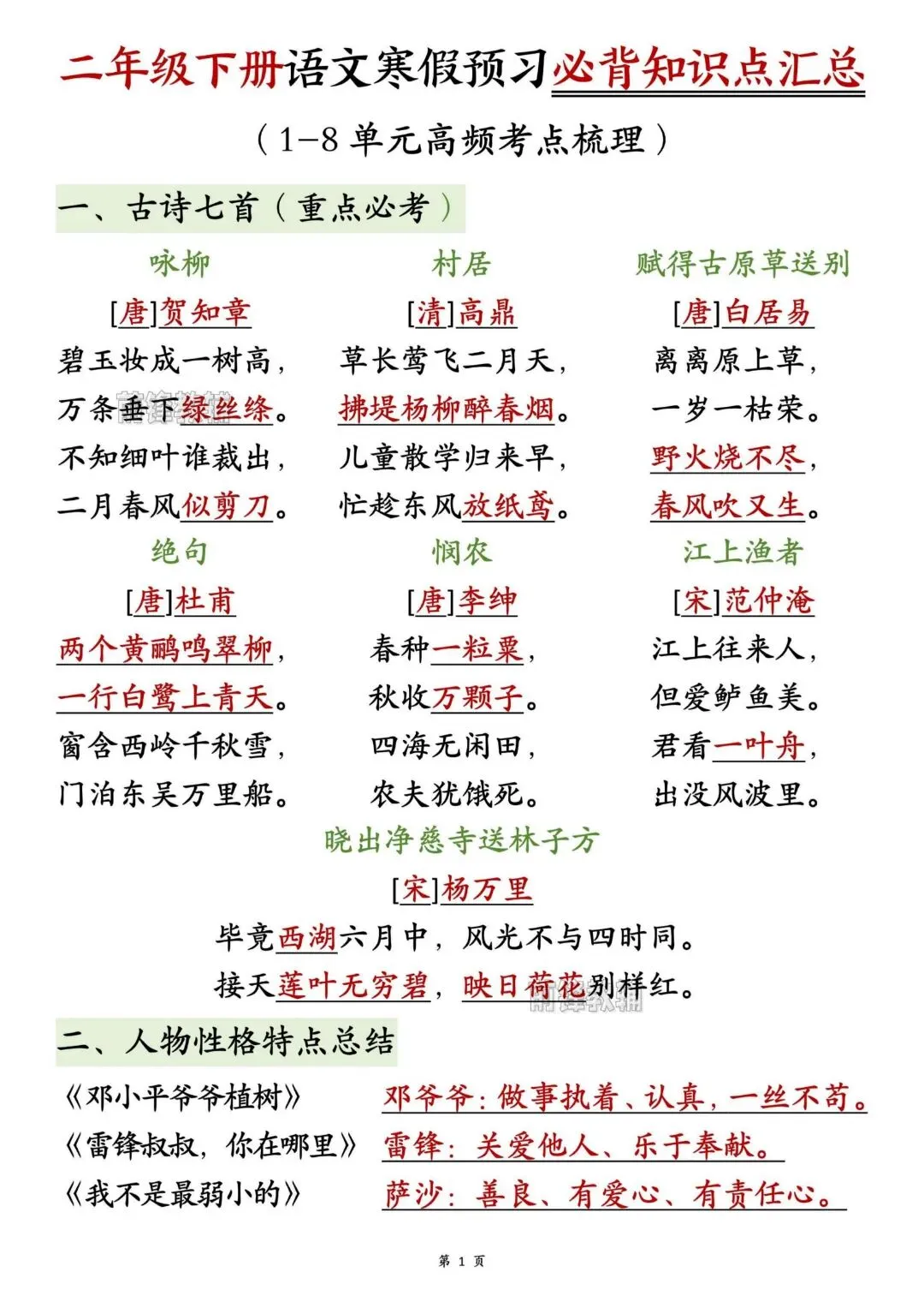 26春人教部编版-二年级下册语文预习必背知识点汇总|高清电子版可打印