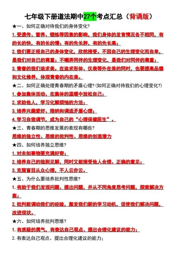 今日分享新七年级下册小四门考点汇总!所有资料均为高清电子版,排版规整适配打印,不用费心整理,直接打印就能用。精准击破学习难点,帮孩子夯实基础、吃透考点,稳步提升学习效率!