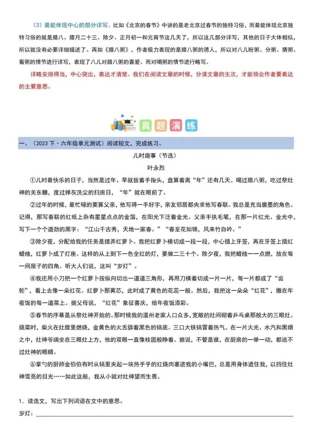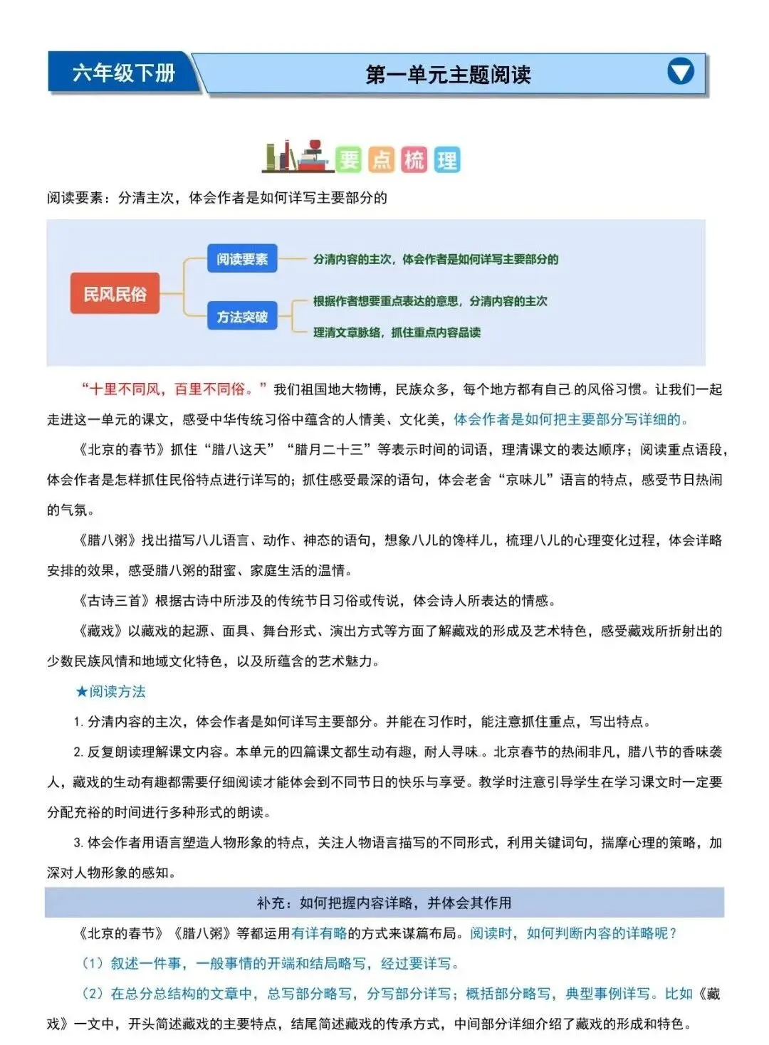 今天给大家分享的是单元主题阅读【六下语文】主题阅读理解,将课内精读与课外拓展完美结合,每一个单元都匹配对应主题的经典阅读文本,从民族风俗到外国名著,从散文感悟到名著赏析,覆盖课本所有核心主题。同时梳理了概括内容、赏析词句、分析人物、领悟主旨等高频题型的解题方法,搭配典型例题与答题思路指导,让孩子掌握 “信息提取 + 逻辑加工” 的阅读底层逻辑。