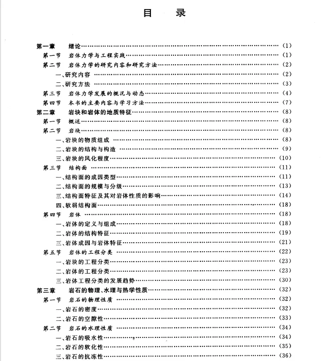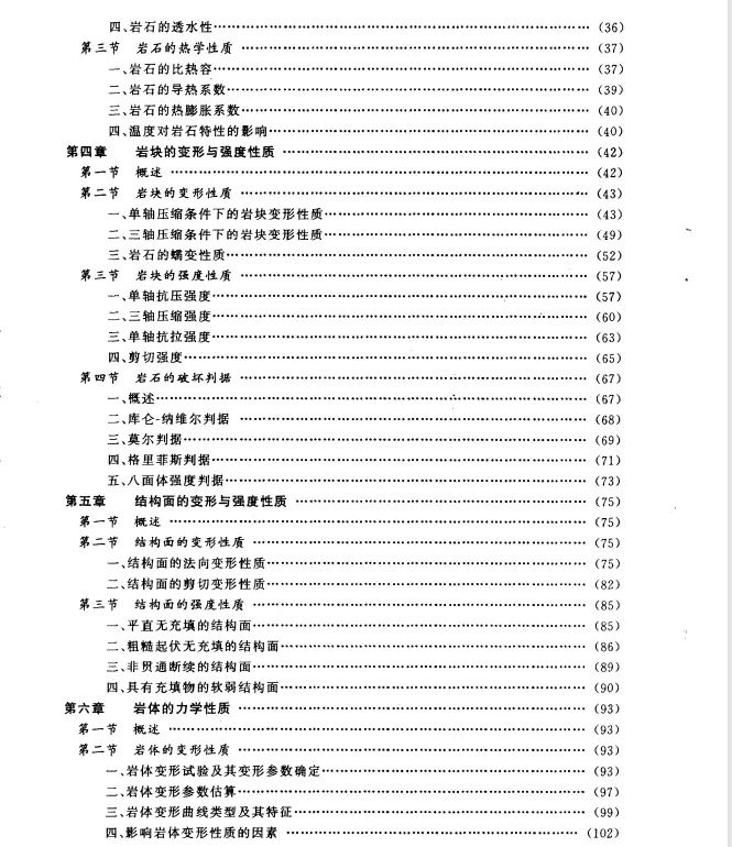 全书分十章,包括:绪论,岩块和岩体的地质特征,岩石的物理、水理及热学性质,岩块的变形与强度性质,结构面的变形与强度性质,岩体的力学性质,岩体中的天然应力,地下洞室、边坡及地基岩体稳定性分析。