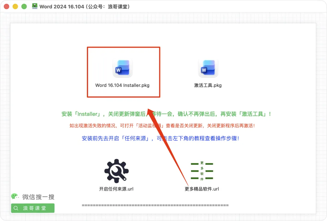 | 4、然后双击「word 16.104 installer.pkg」开始软件安装; |