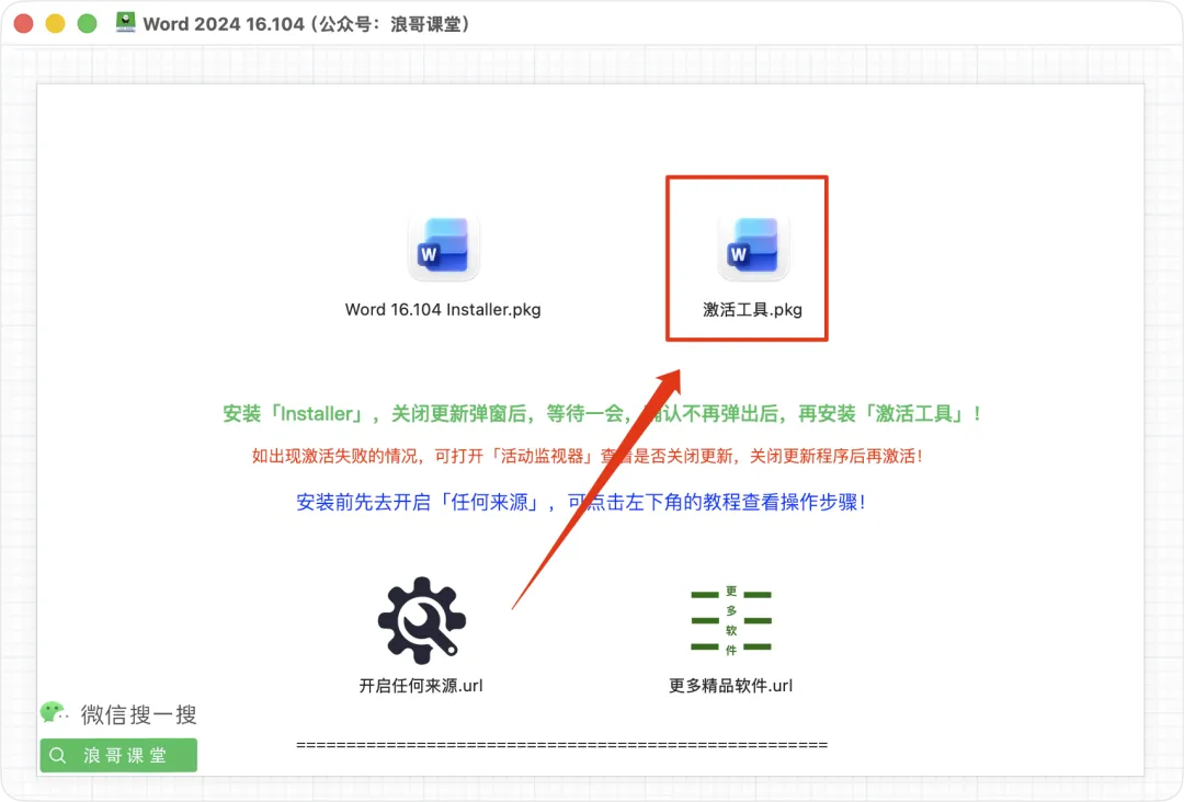 | 11、返回软件安装镜像,双击开始安装「激活工具.pkg」; |