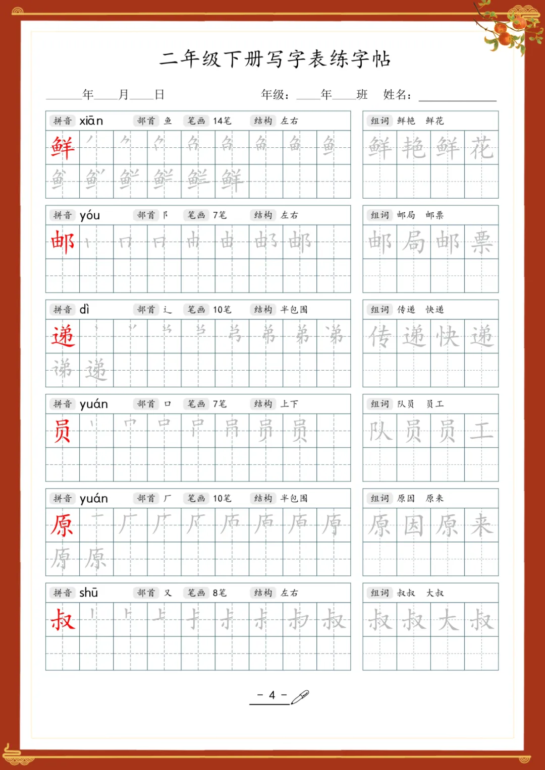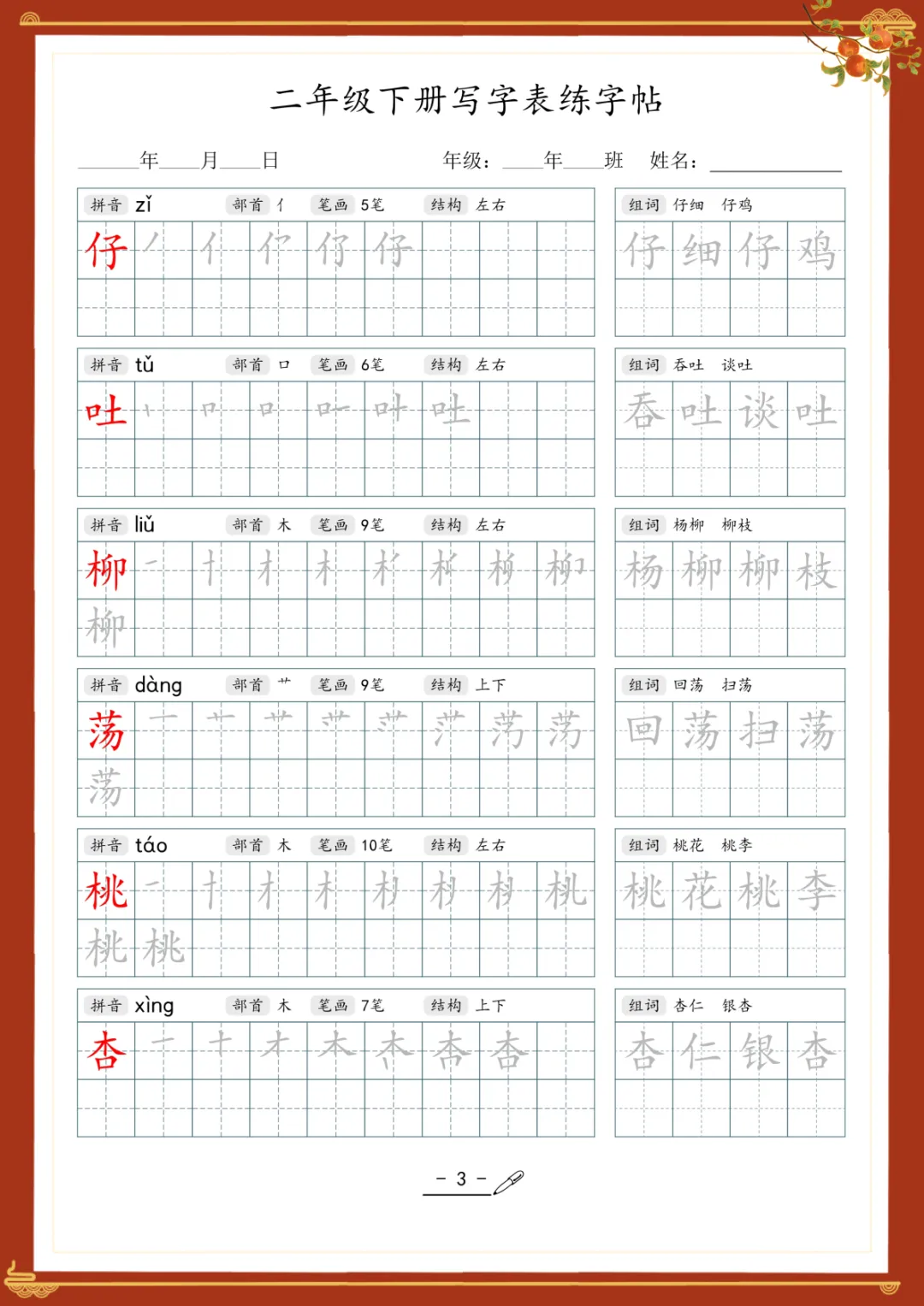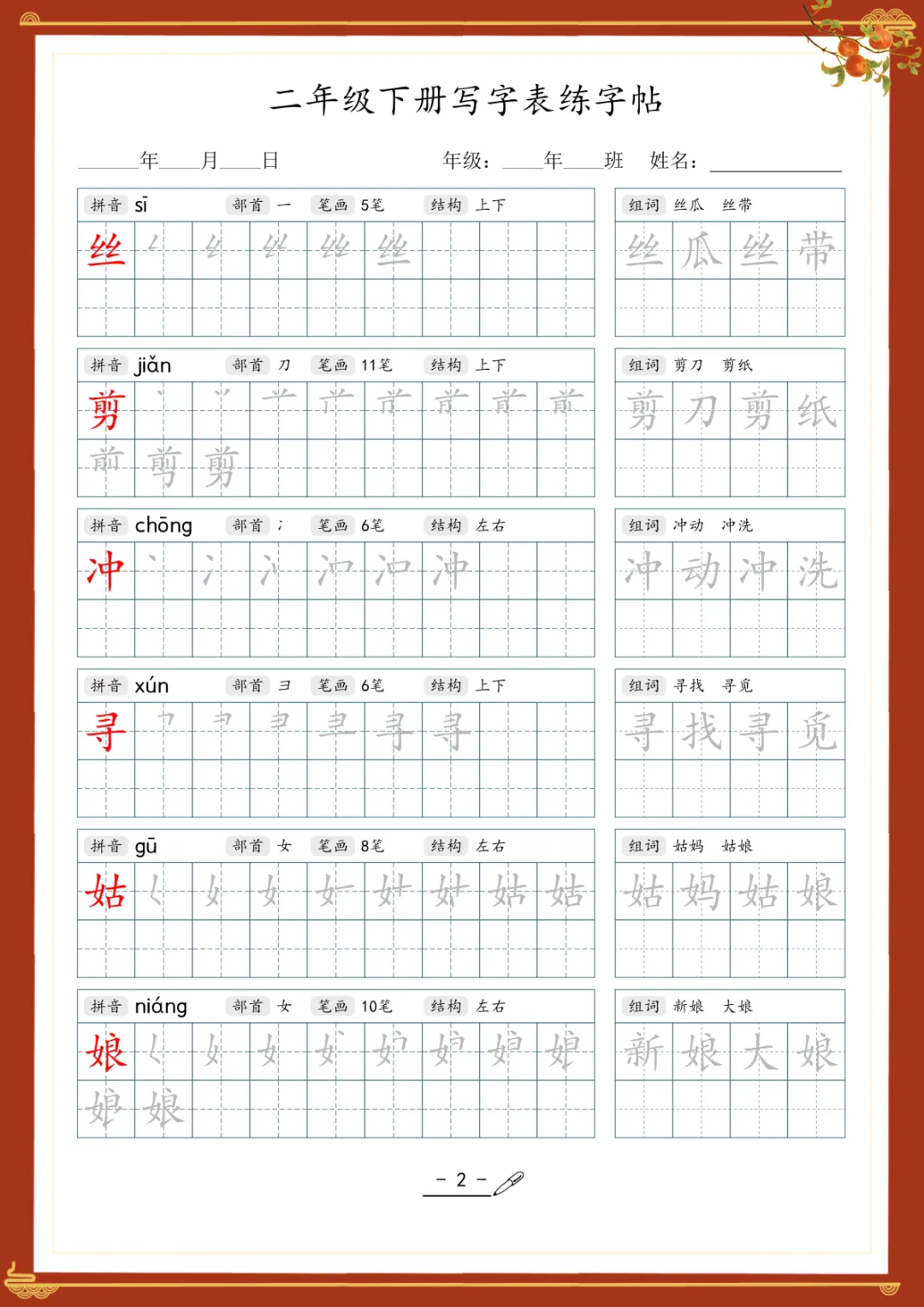 部编版二年级下册语文全册写字表生字字帖 电子版可下载