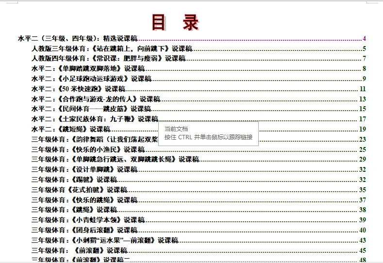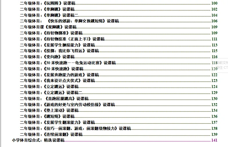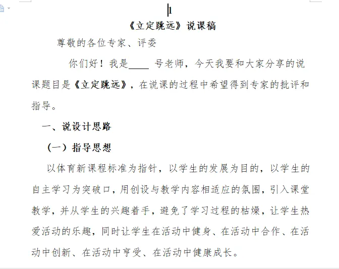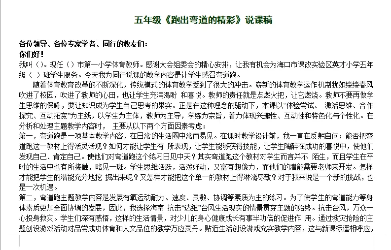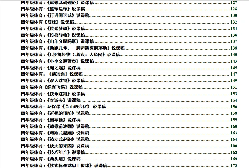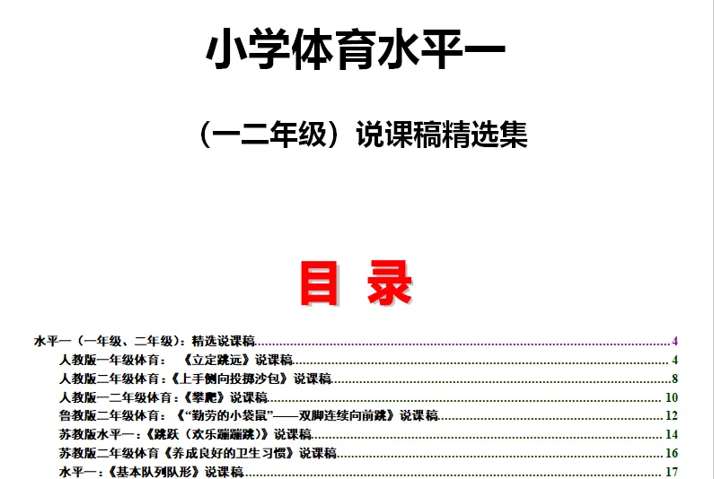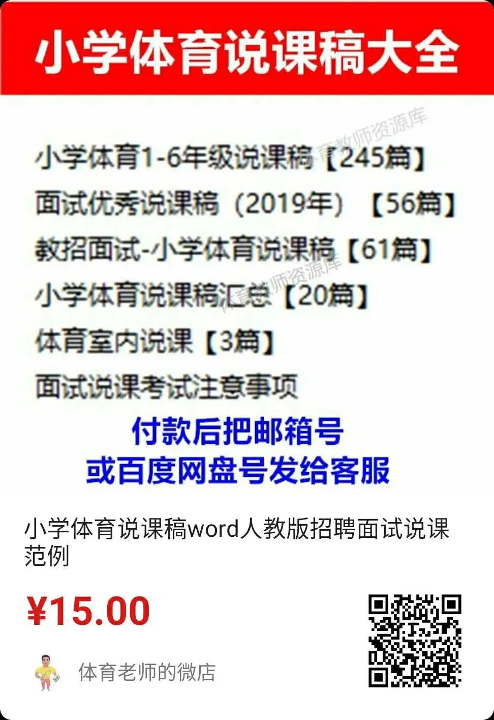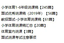 小学体育说课稿大全(可编辑打印) 更多精彩,请点击上方蓝字关注我们! 小学体育说课稿包含1-6年级 每个年级各个项目都有 说课稿为word格式 可以自己修改、编辑、打印 适合教招面试、教学比赛等场合 需要请扫码购买 下面是说课稿部分展示 更多体育资料请看下面 小学足球教案集+训练计划 小学篮球教案集+篮球队训练计划及教案 小学体育全套课件PPT 人教版小学体育1-6年级室内PPT+教案 初中体育全套PPT 体育优质课视频+大课间方案视频(小初高全有) 人教版小学体育优质课教学视频(配套视频、课件、教案) 人教版初中体育优质课教学视频(配套视频、课件、教案) 人教版高中体育优质课教学视频(配套视频、课件、教案) 幼儿园体育优质课视频+教案 体育教师资格证面试资料 体育教师招聘专业知识题库(适用全国范围) 初中体育课件PPT大全(电子版可修改) ● 初中7-9年级体育课件大全 ●中考体育居家训练方法 ●眼保健操(最新版)完整示范+分解动作 ●小学生广播体操《七彩阳光》教学视频 ●小学生广播体操《希望风帆》教学视频 ●中学生广播体操《舞动青春》教学视频 ●中学生广播体操《放飞理想》教学视频 ●武术操《旭日东升》教学视频 ●武术操《英雄少年》教学视频 ●五步拳分解动作-教学视频 ●国家队教练亲授中考体育训练方法 ●中学体育网课:体能恢复训练PPT可下载 戳下面的原文阅读,购买小学说课稿资料