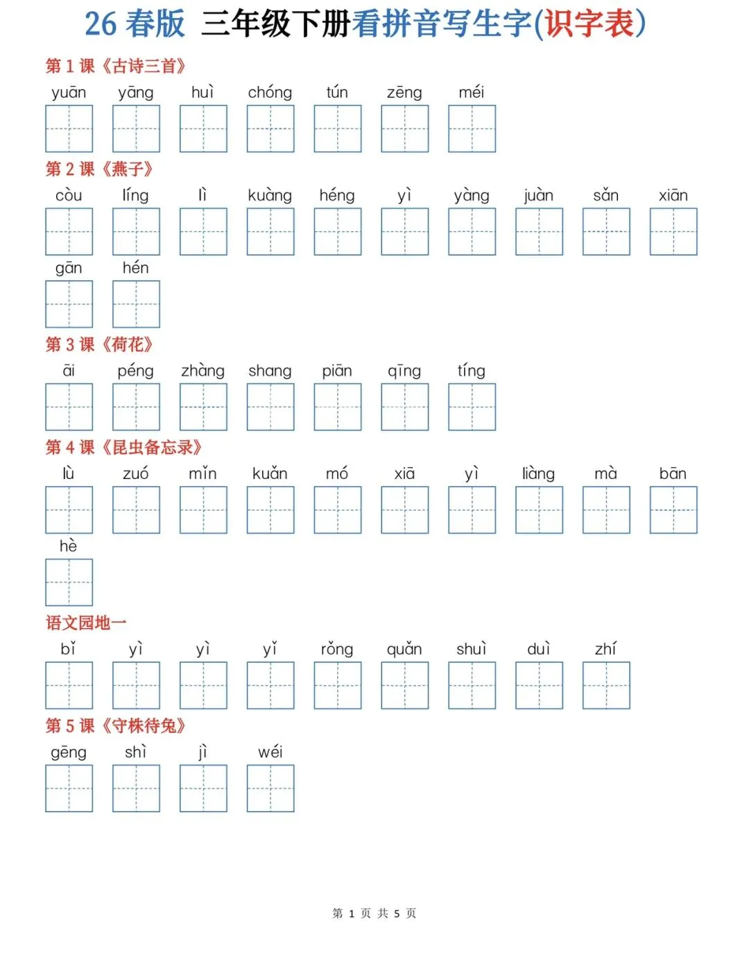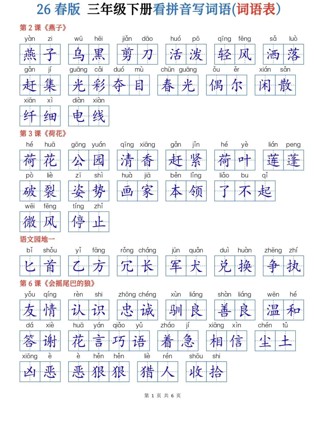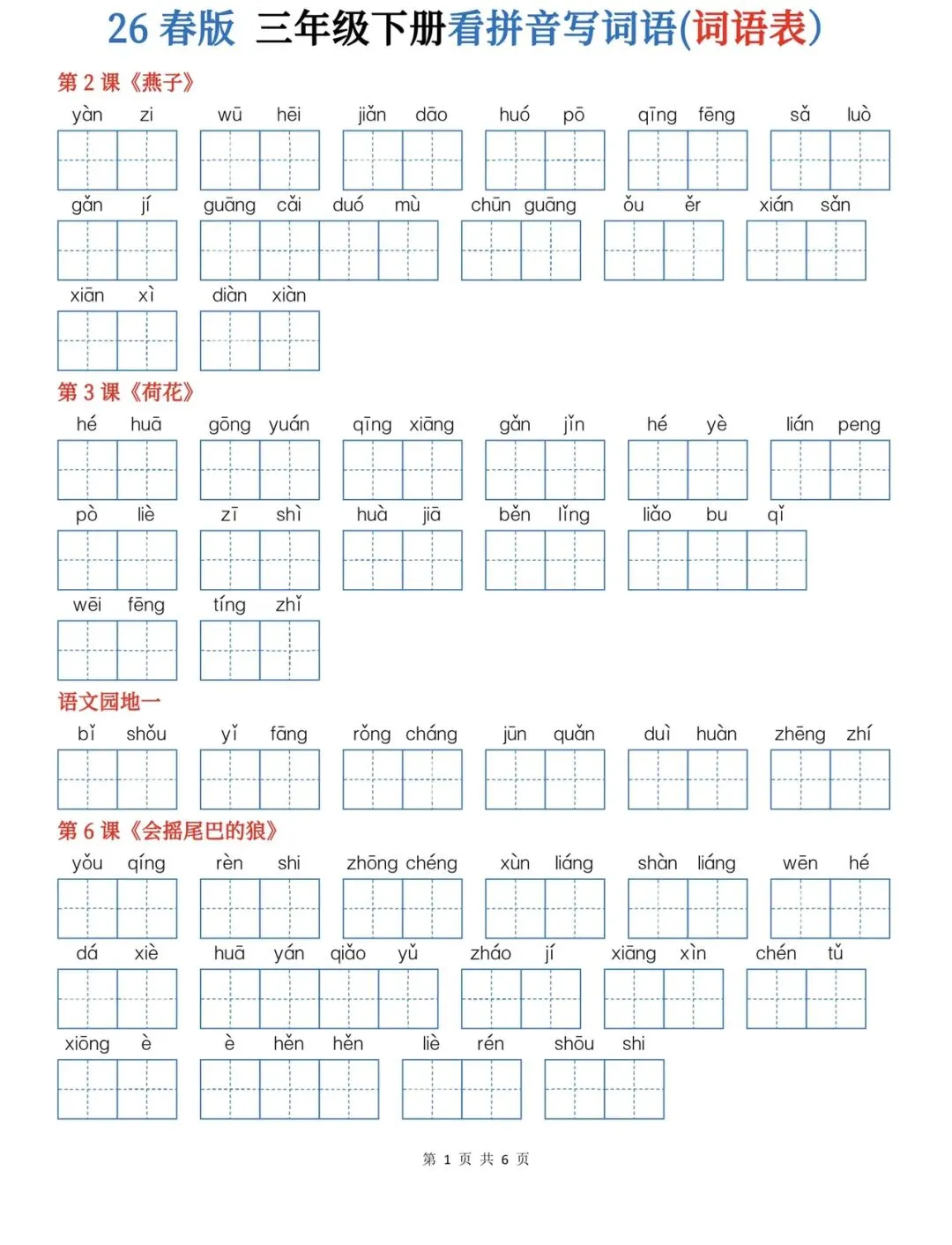 大家好,我是小敏妈妈,今天为大家分享的是;2026春季版三年级下册语文看拼音写词语(含答案)电子版可打印