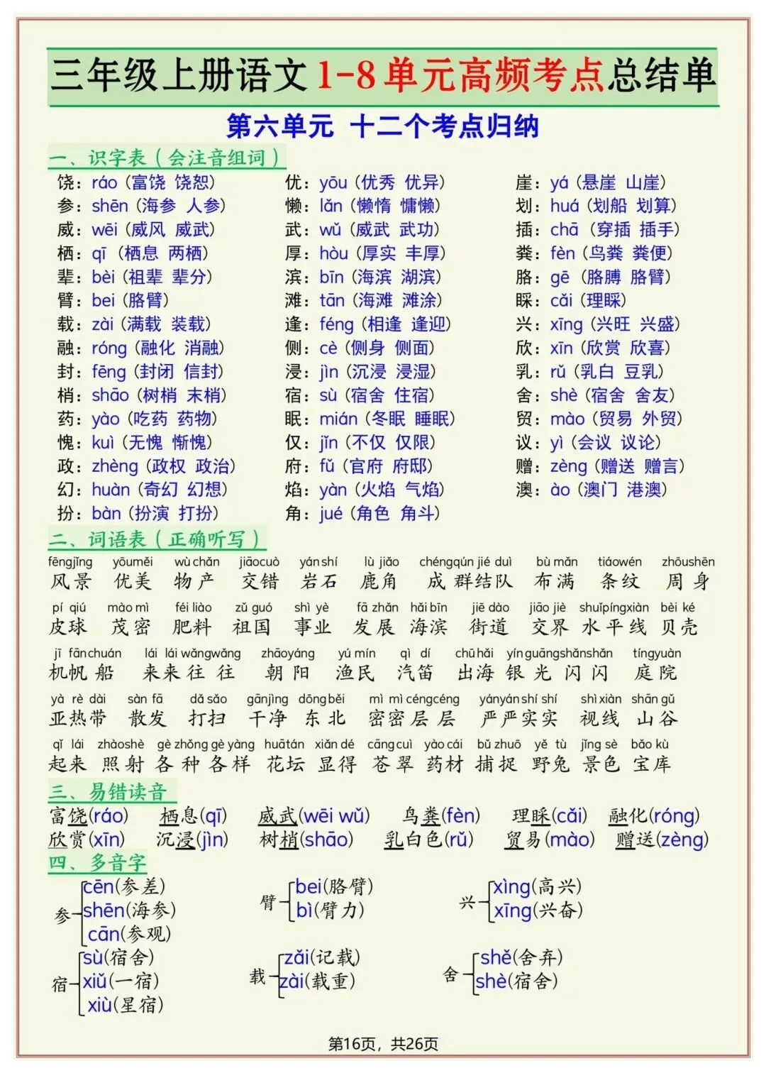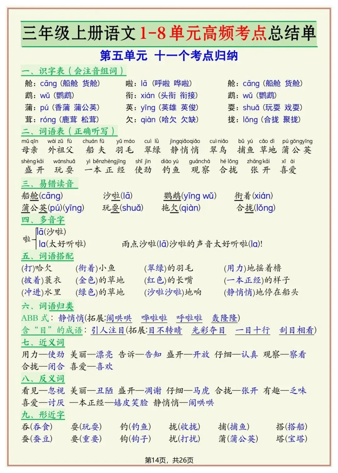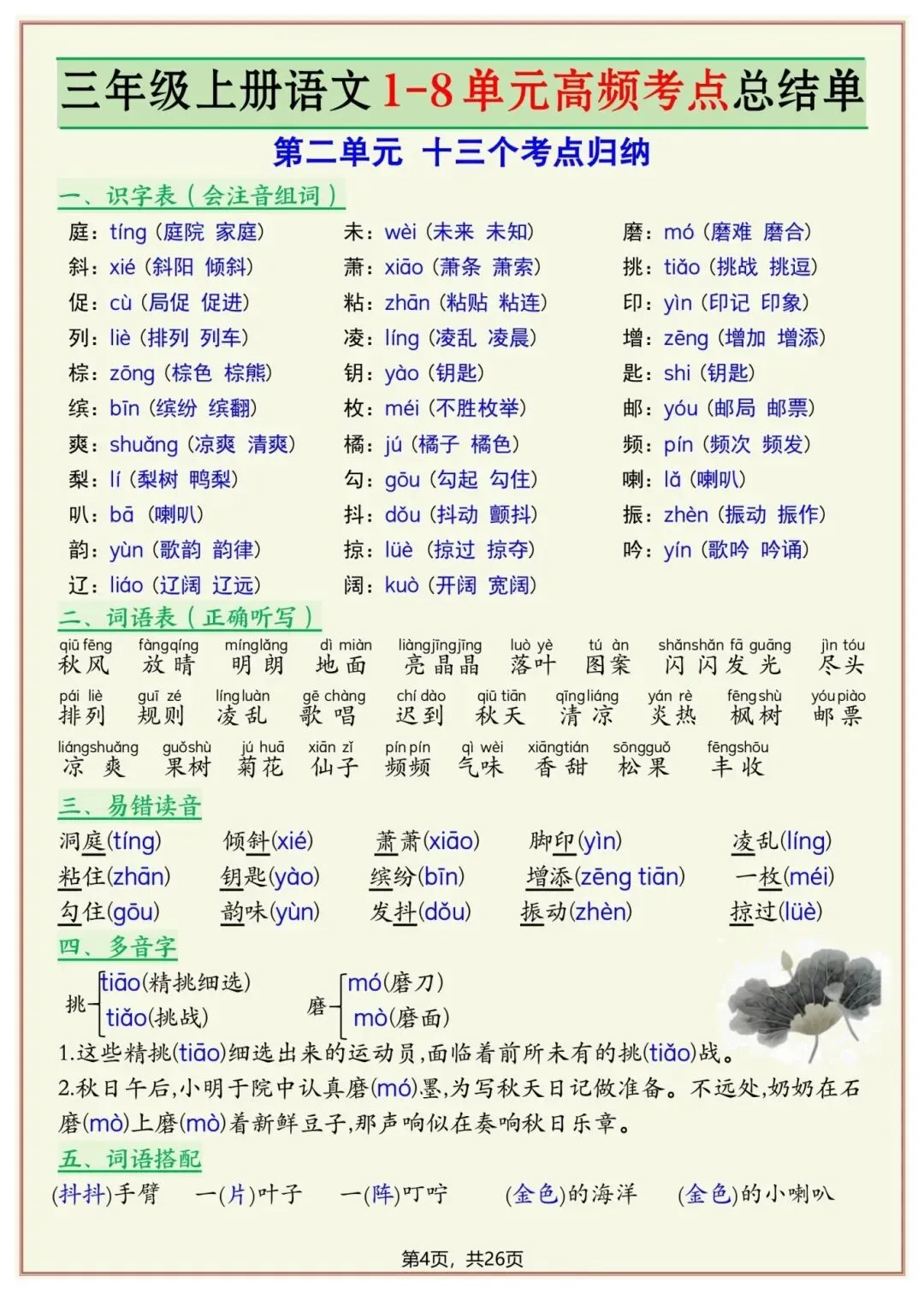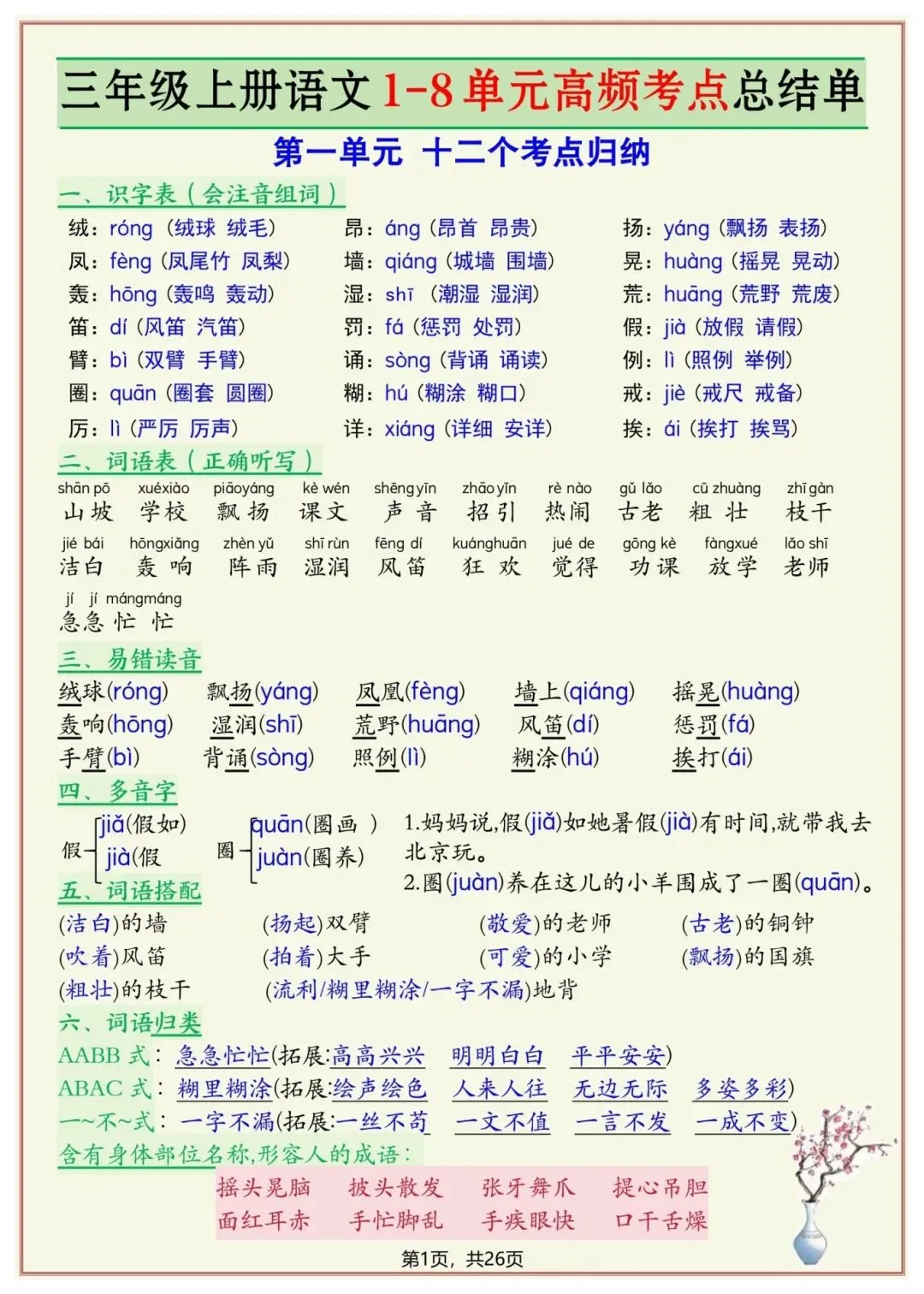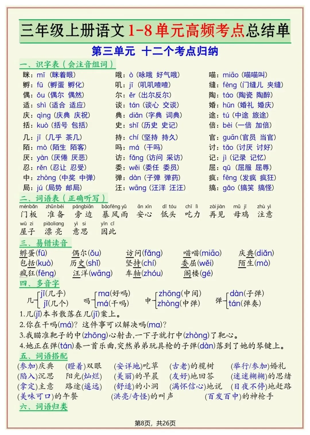 三年级上册语文1-8单元高频考点总结单,电子版可下载打印