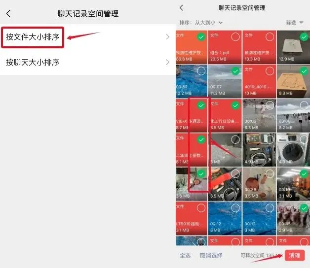 此外对于聊天记录可以点击管理,可以选择按文件大小排序也可以选择按聊天大小排序,如果选择按聊天大小排序,对于不需要的对话框进行勾选,然后点击清理即可。这里删除的只是图片、视频和文件,文字、语音包、表情包则不会丢失。