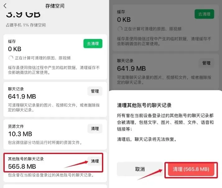 对于资源文件,我们可以选择不清理,因为比较小,这个是包含了微信部分功能运行时所需要的资料,删除后可能需要重新下载。另外对于其他账号的聊天记录,直接点击清理,再次点击清理,这样就可以清理成功了。