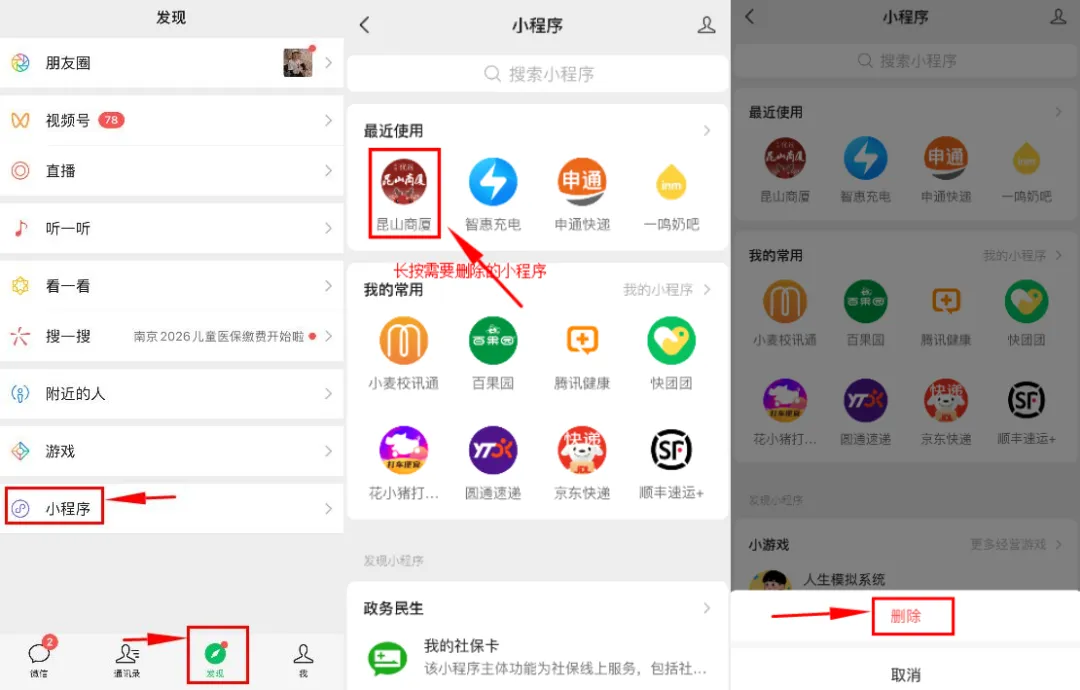 在微信发现界面,点击小程序,长按你想要停用的小程序,选择删除即可。