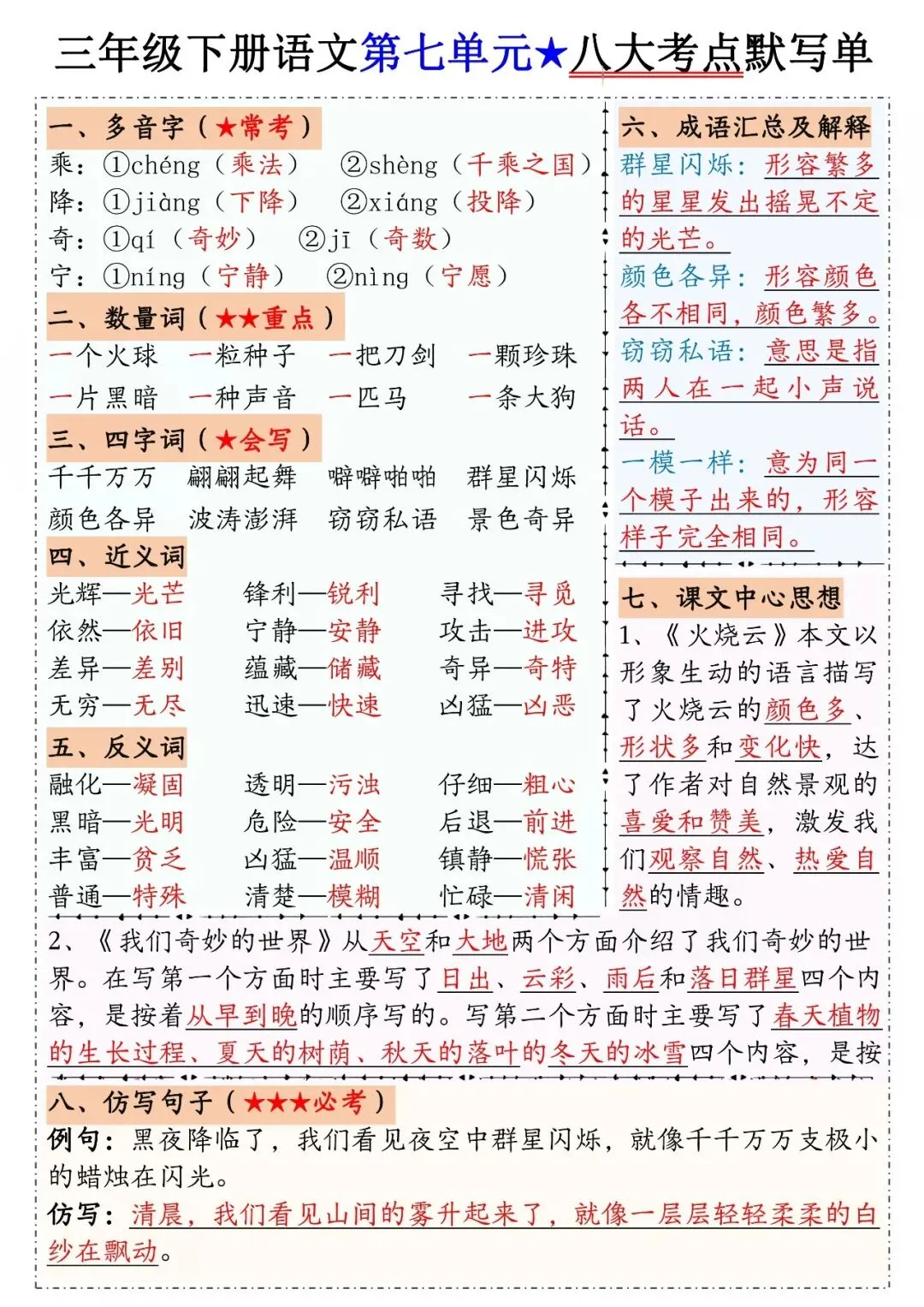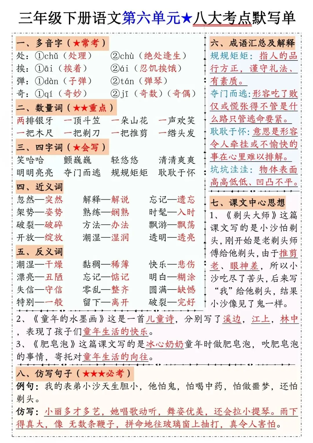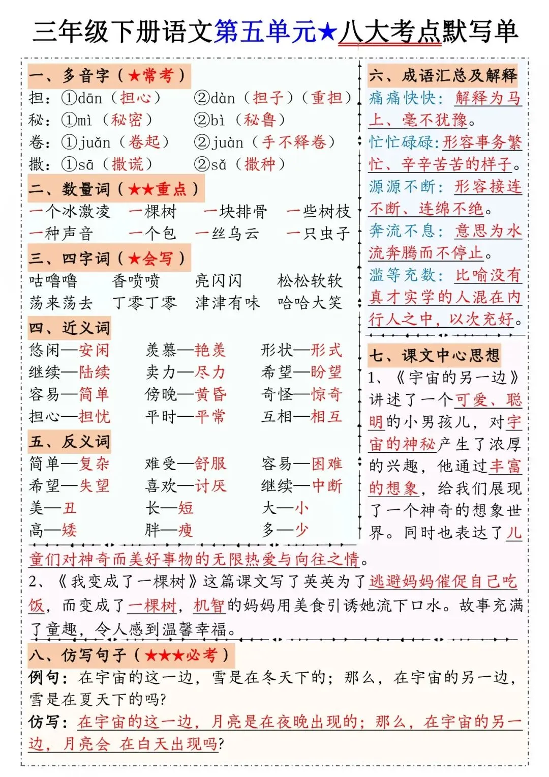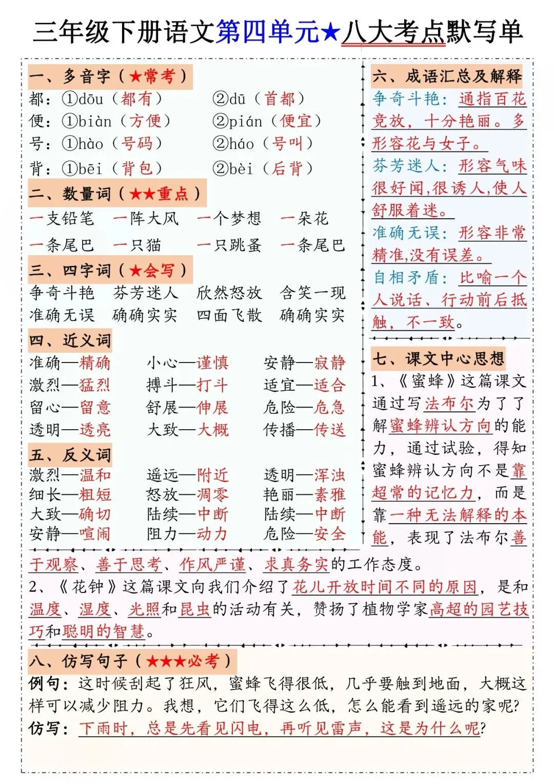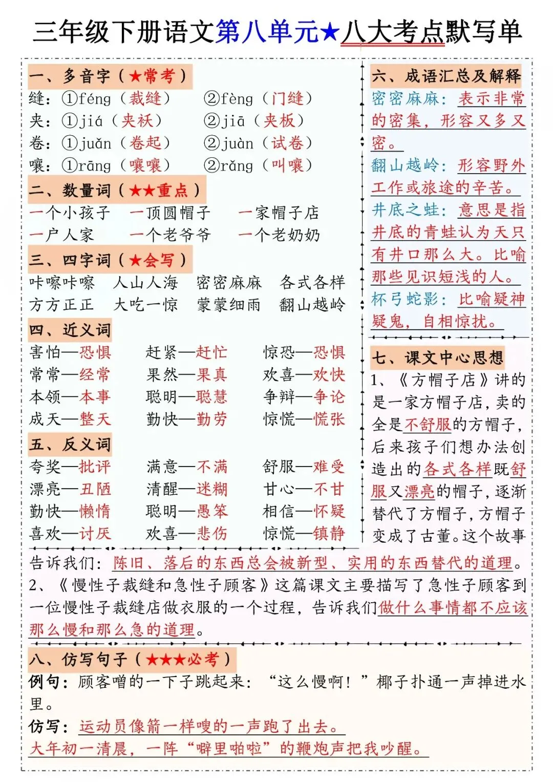 三年级下册语文1-8单元八大考点默写单,电子版可打印可下载