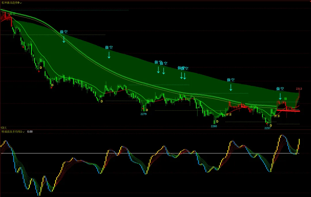 1、乾坤擒龙趋势9主图,财通波段多均线幅图