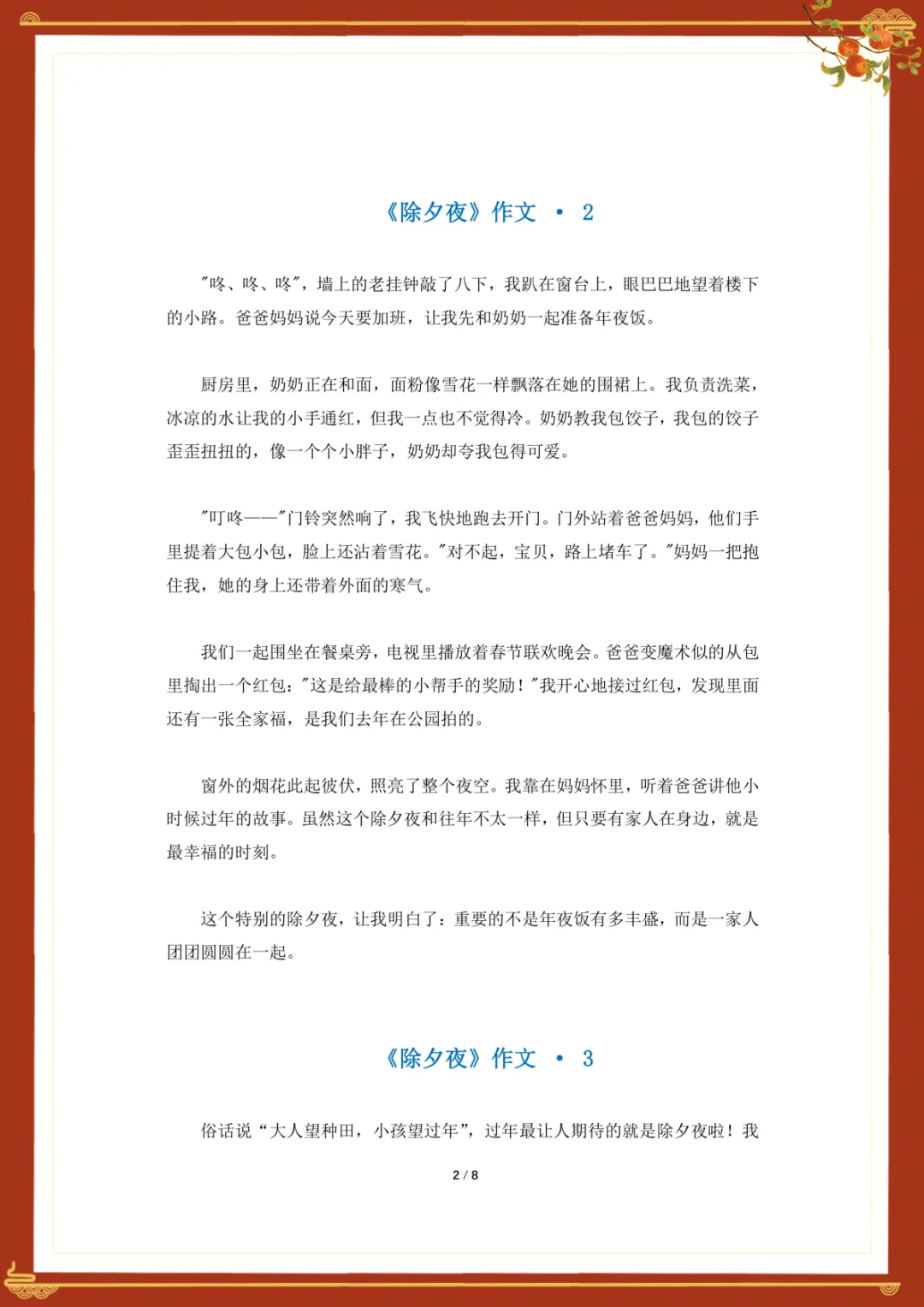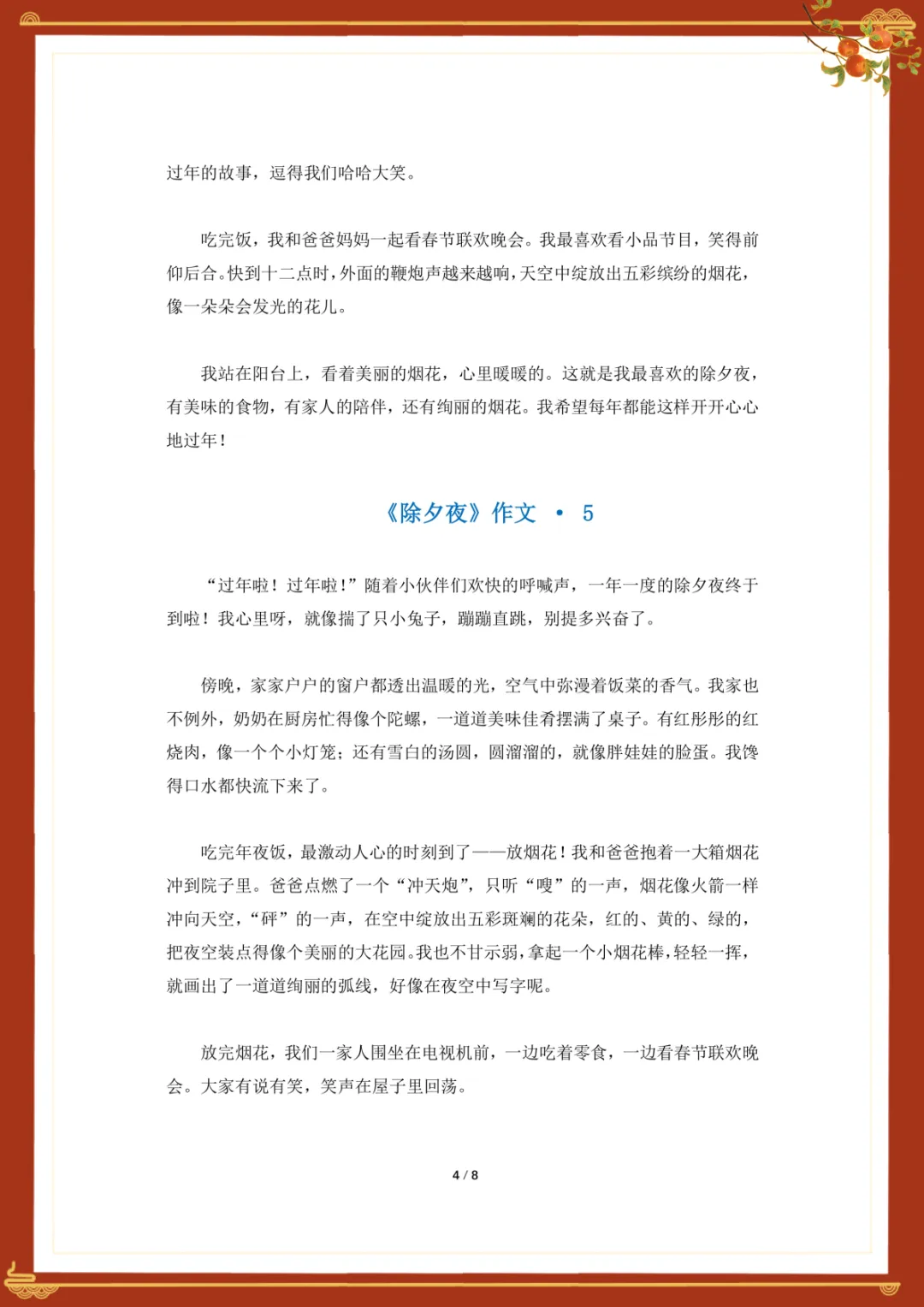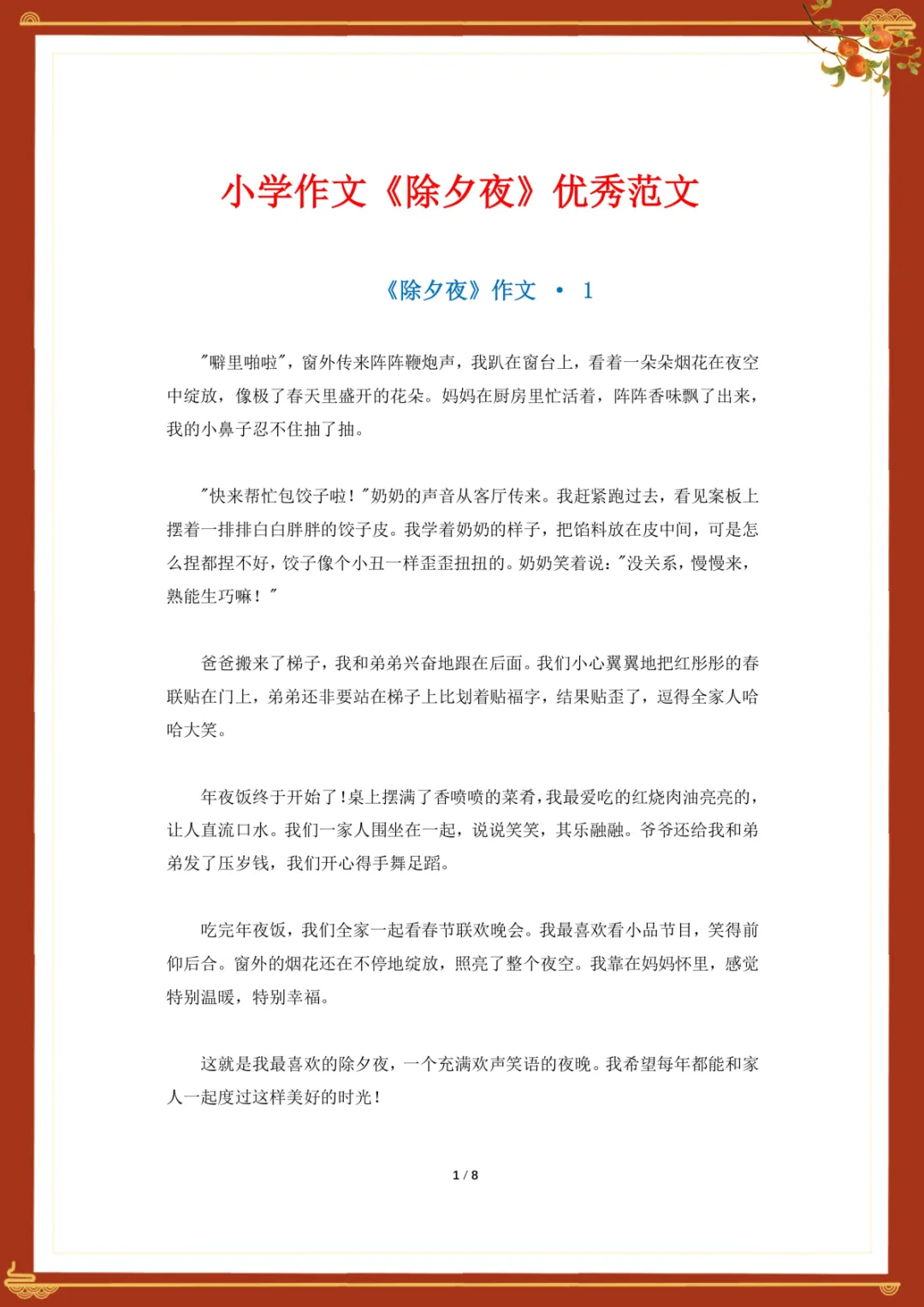 小学作文《除夕夜》优秀范文 电子版可下载