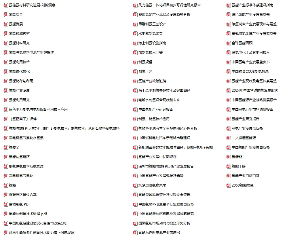 为了帮助大家更深入的学习氢能知识,我还整理了 60+ 份氢能资料,包括 《氢能产业研究报告》、《氢能十解》、《中国绿氢行业市场调研报告》等等。