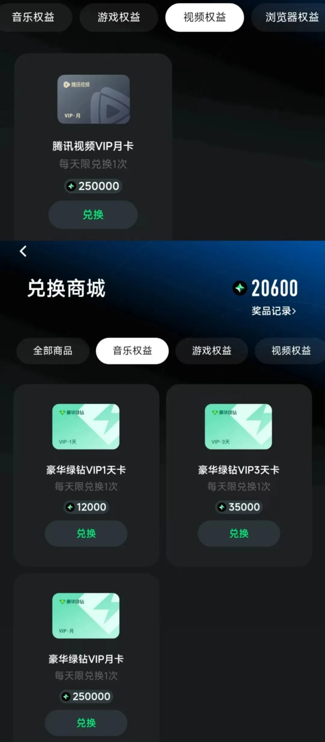 视频方面,使用25万积分可以兑换腾讯视频VIP月卡。
