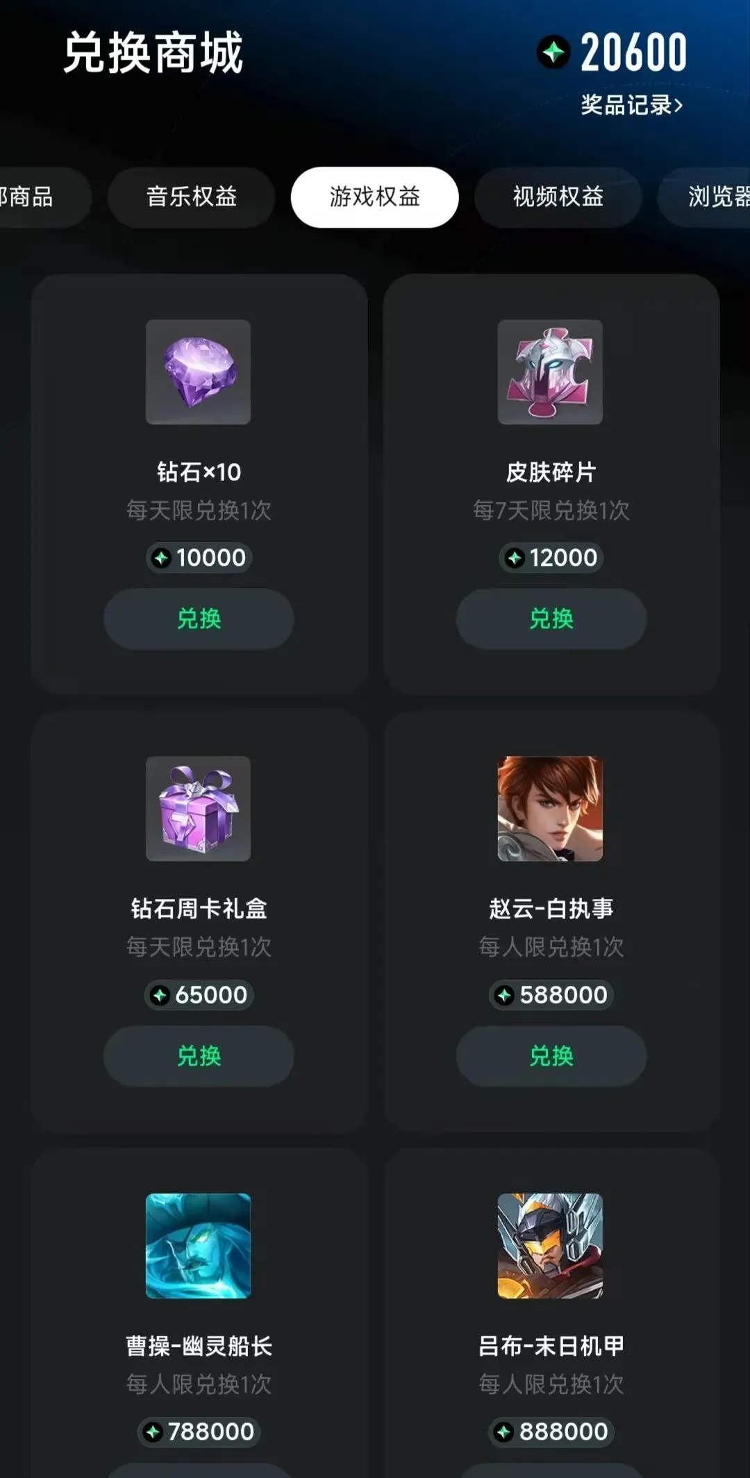玩王者荣耀游戏的话,可以兑换钻石、皮肤碎片、各种英雄的皮肤(每人限兑换1次)。