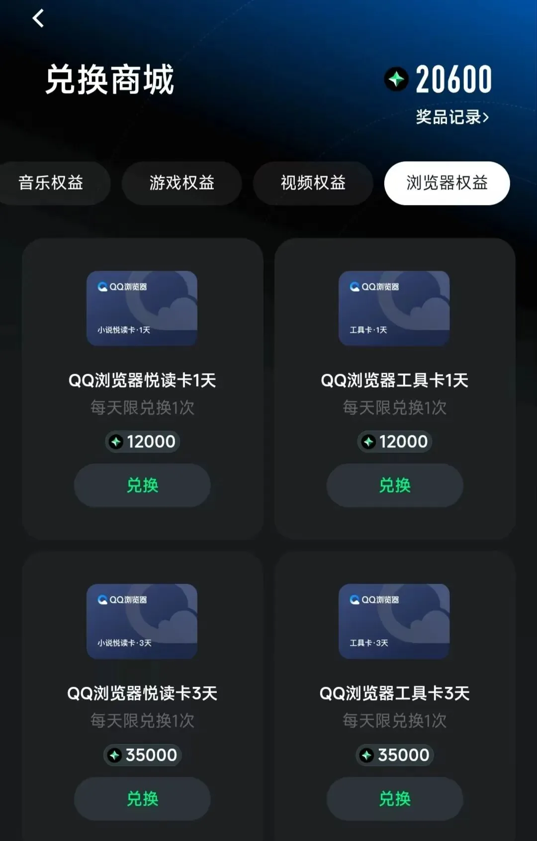 QQ浏览器的悦读卡、工具卡,1天、3天,可以选择兑换。