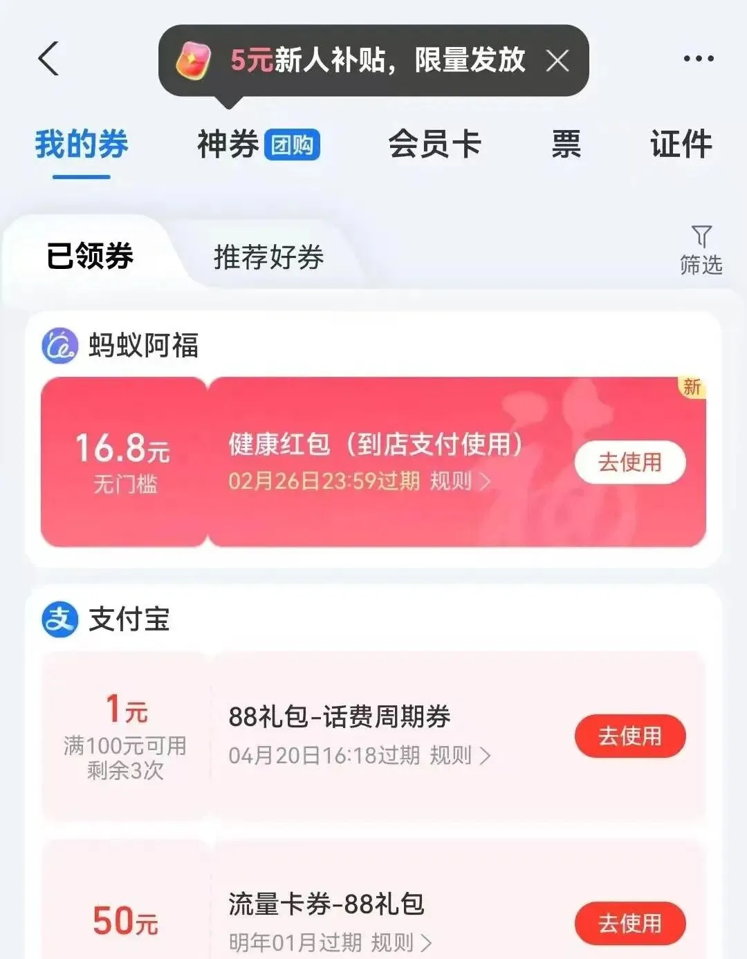 在支付宝首页的卡包中就看到礼包。