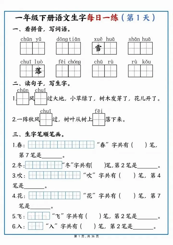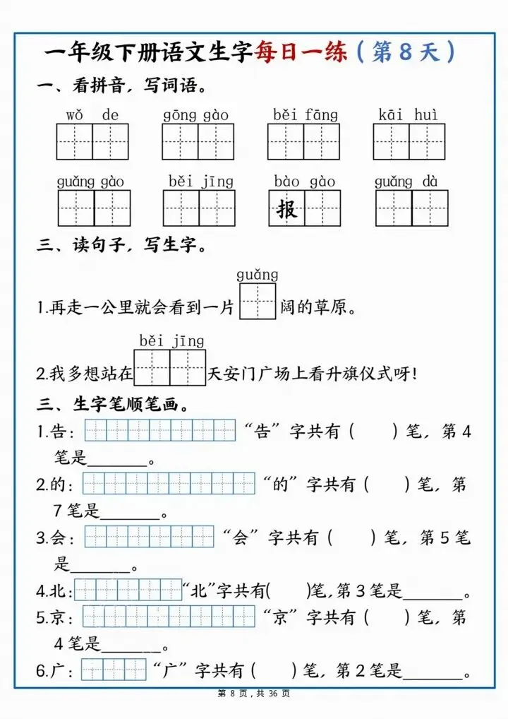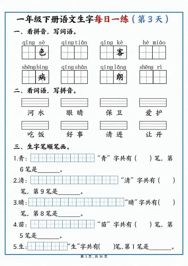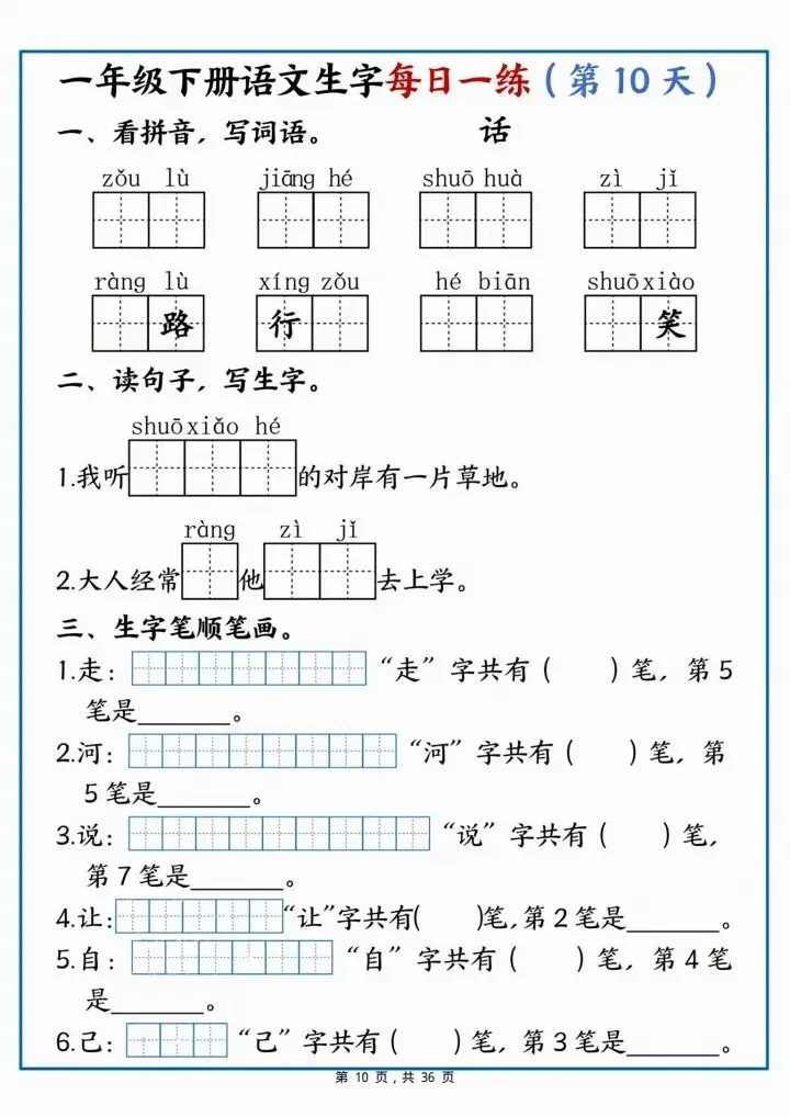 今日份分享一年级下册语文生字每日一练!这份资料已经整理成可打印版本,方便孩子随时翻看学习,建议家长先收藏,再转发给身边有需要的家庭,一起帮助孩子高效学习~
