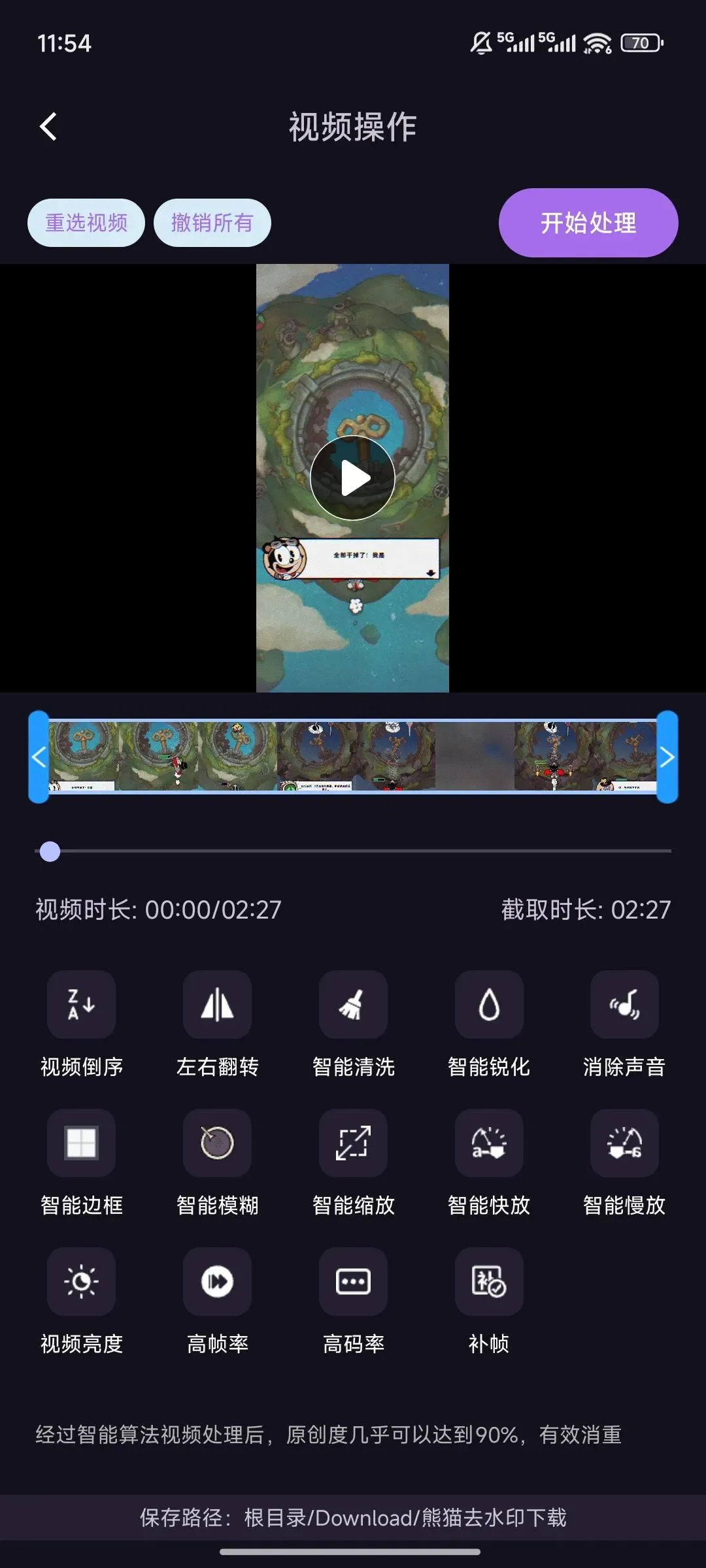 视频剪辑功能,里面智能清洗、智能锐化、消除声音、智能边框、智能模糊等十四种视频处理工具,经过智能算法处理视频后,原创率高达90%,可以有效消重。