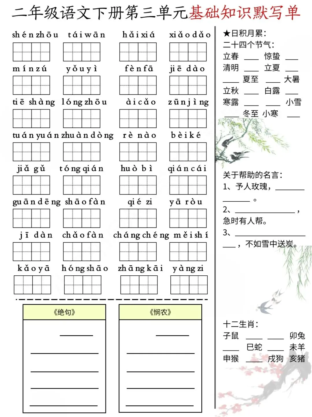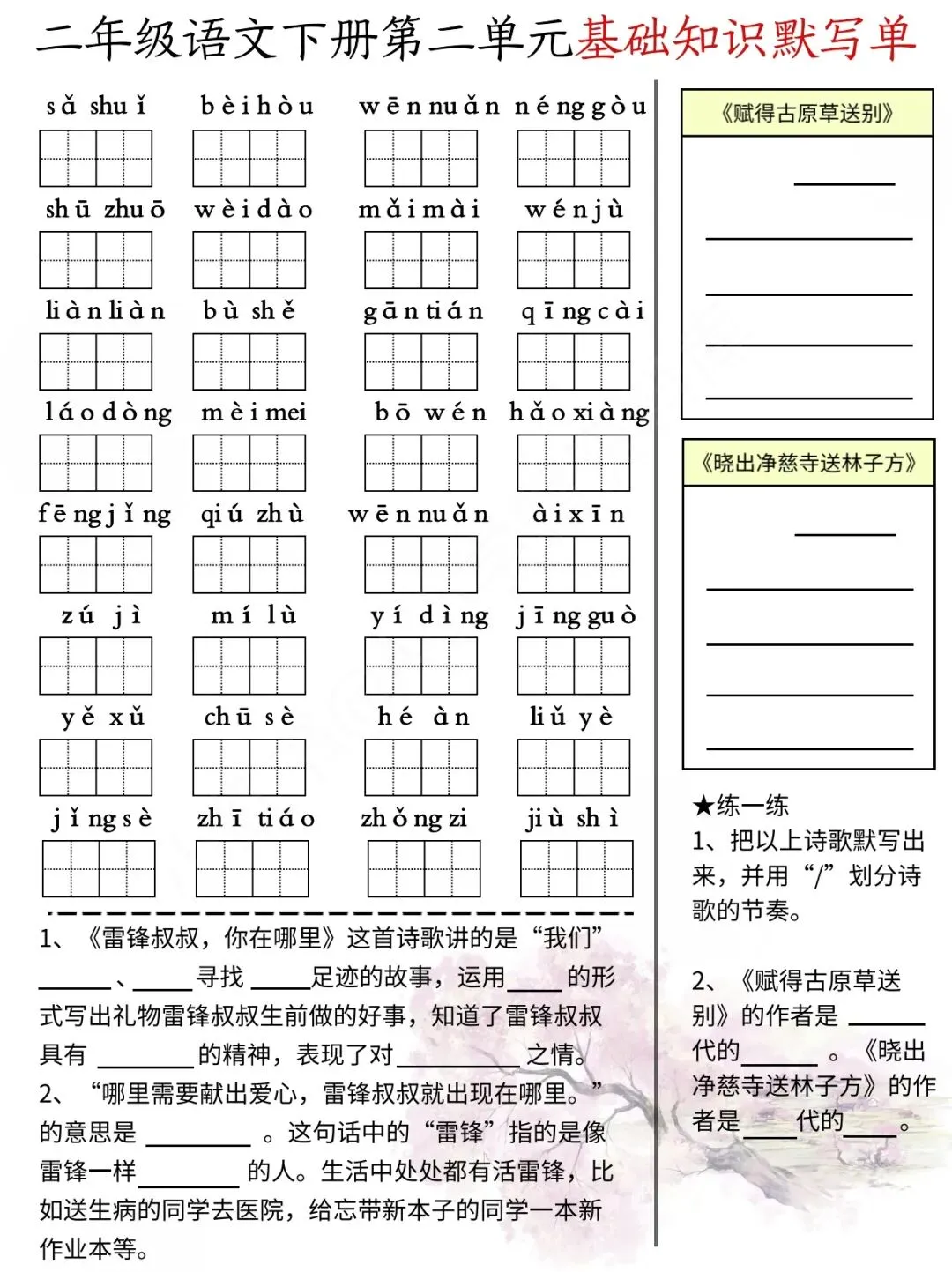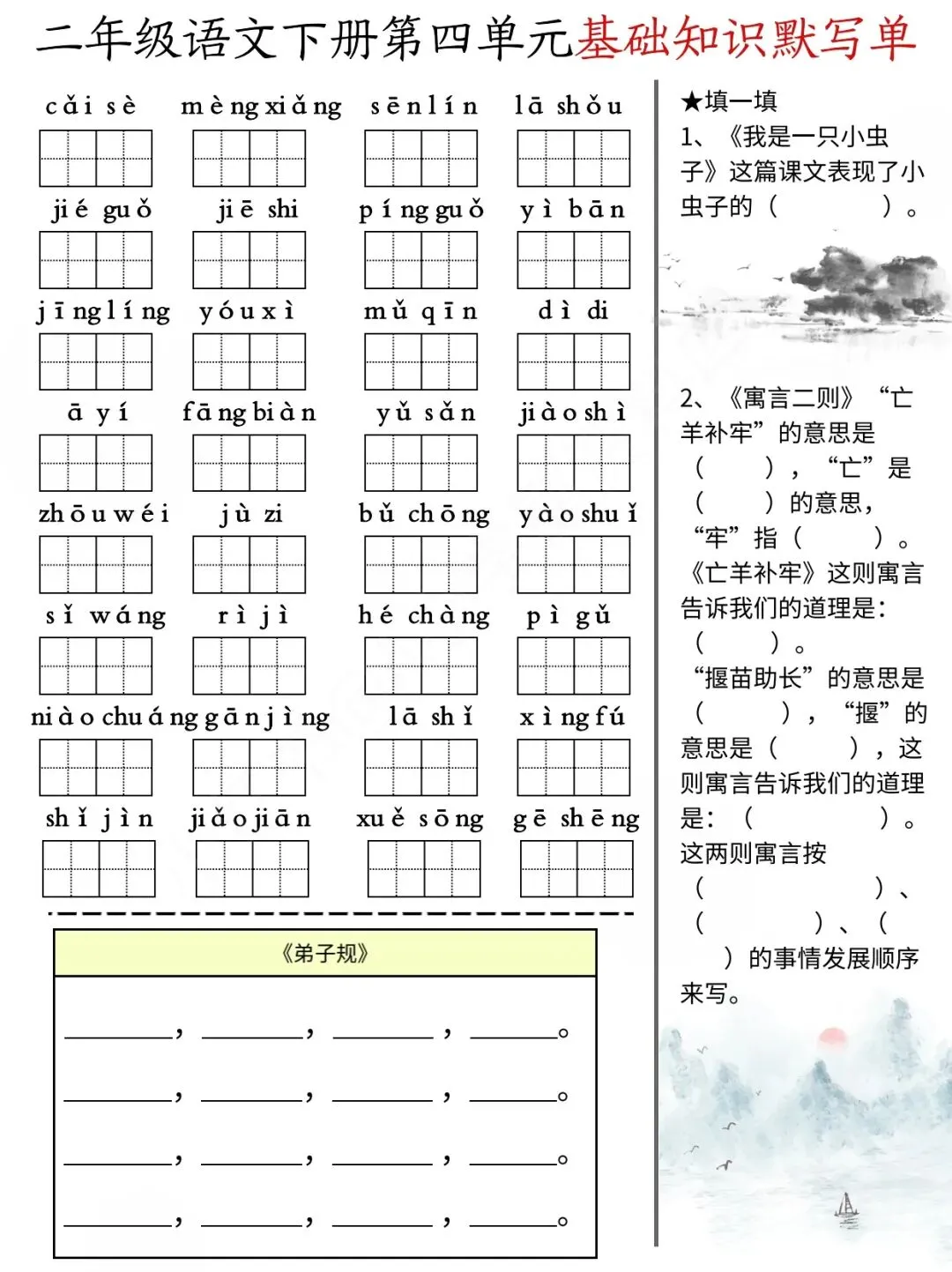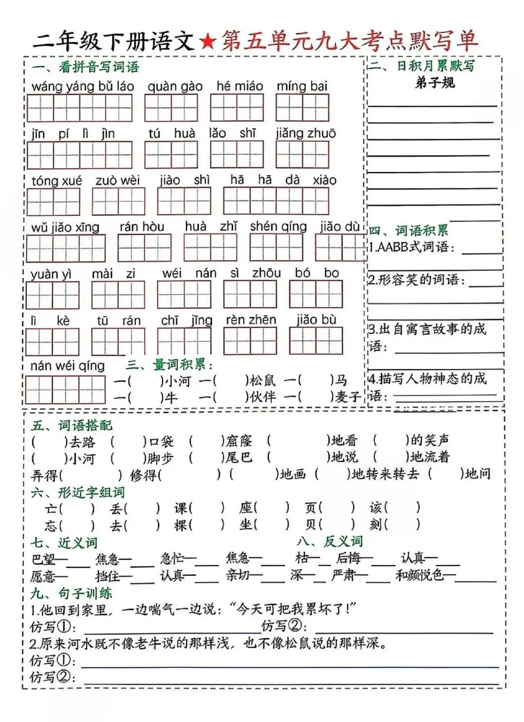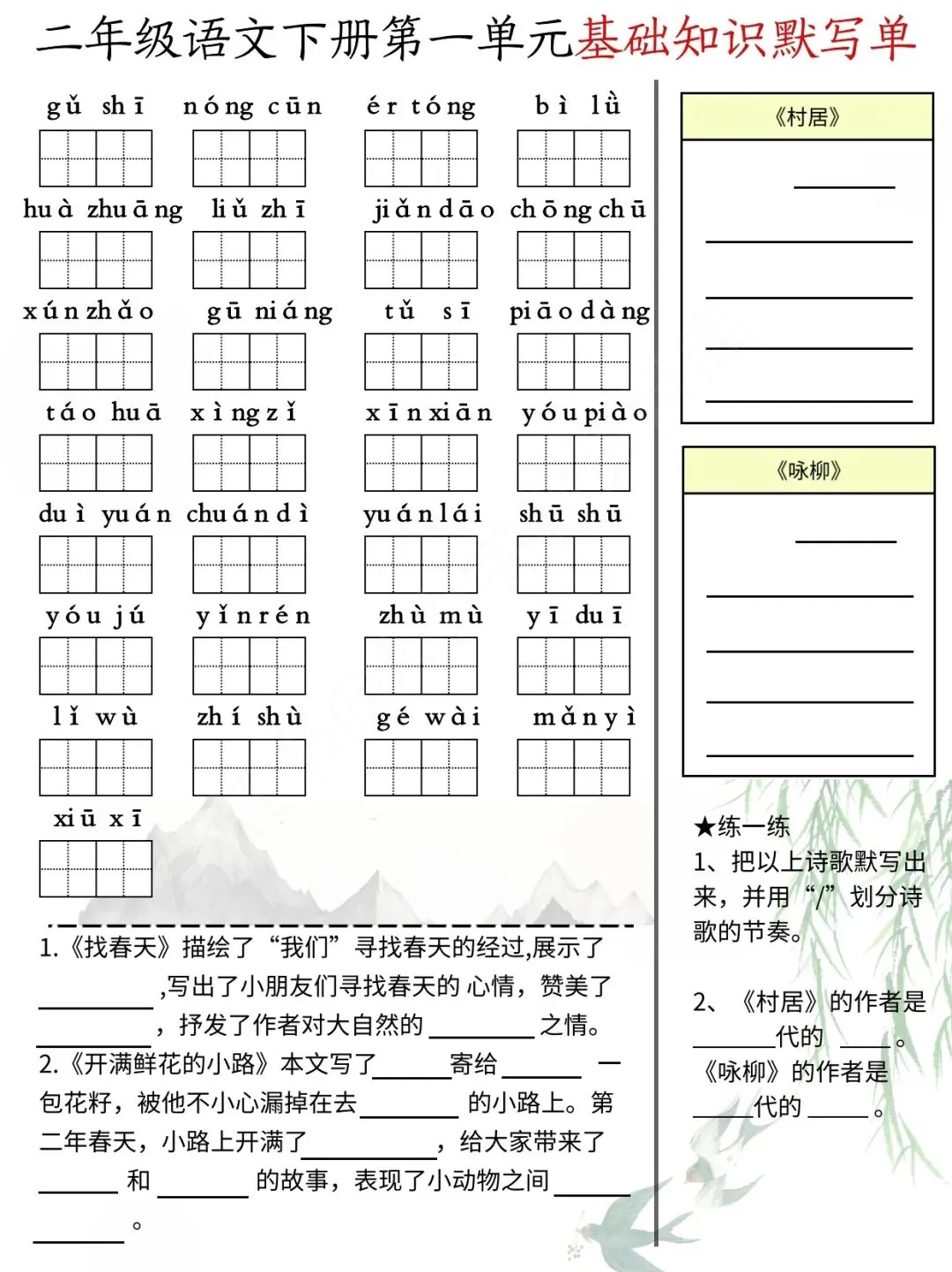 二年级下册语文1-8单元基础知识默写单,电子版可打印