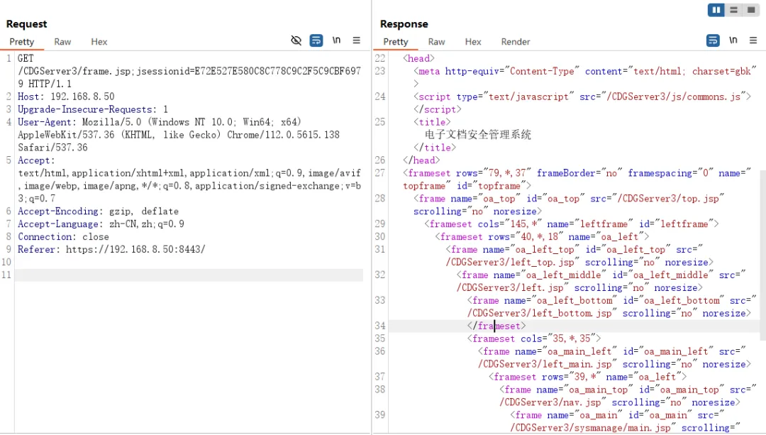 可通过发送如下POC进行验证。如果漏洞存在则会跳转到frame.jsp