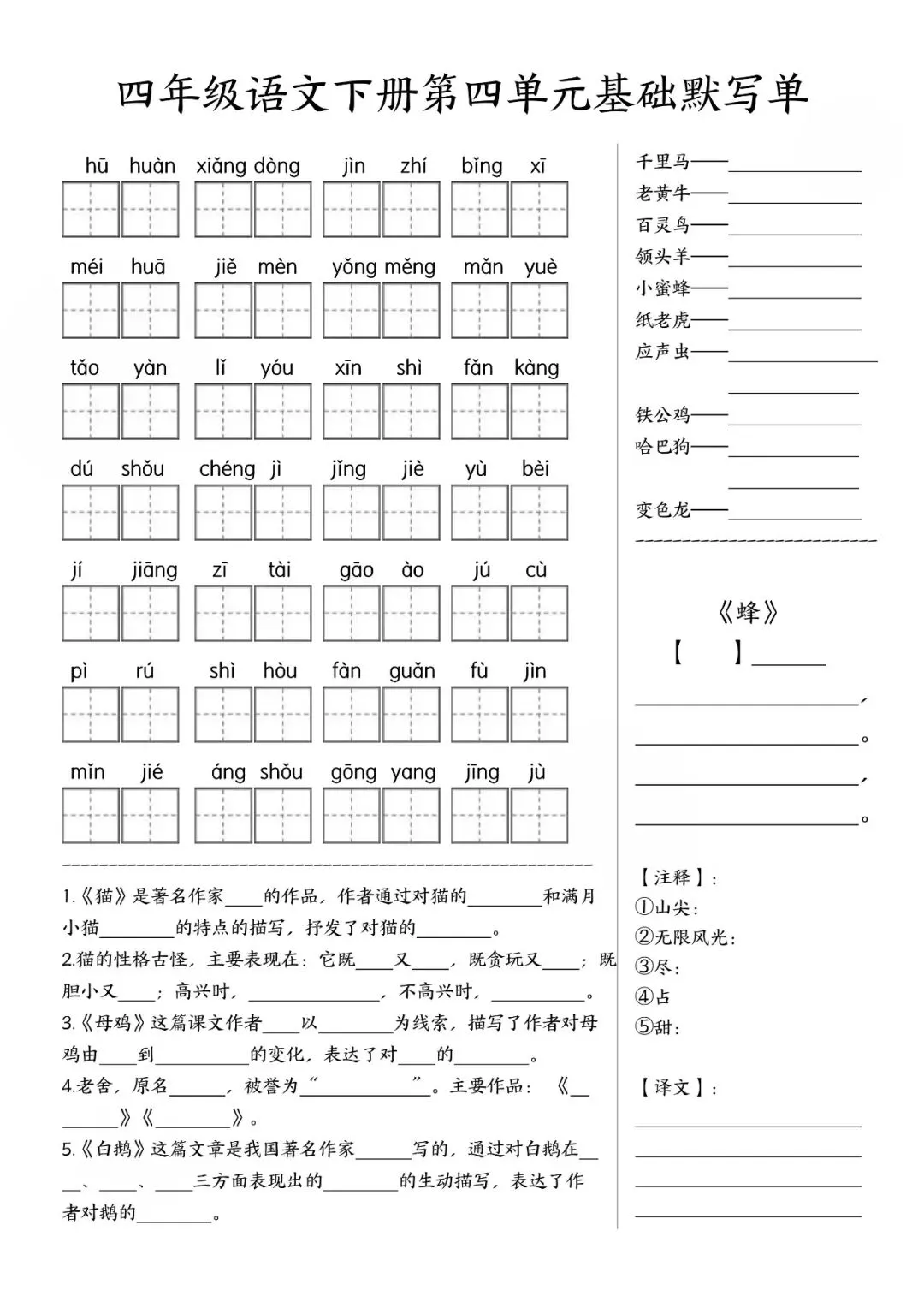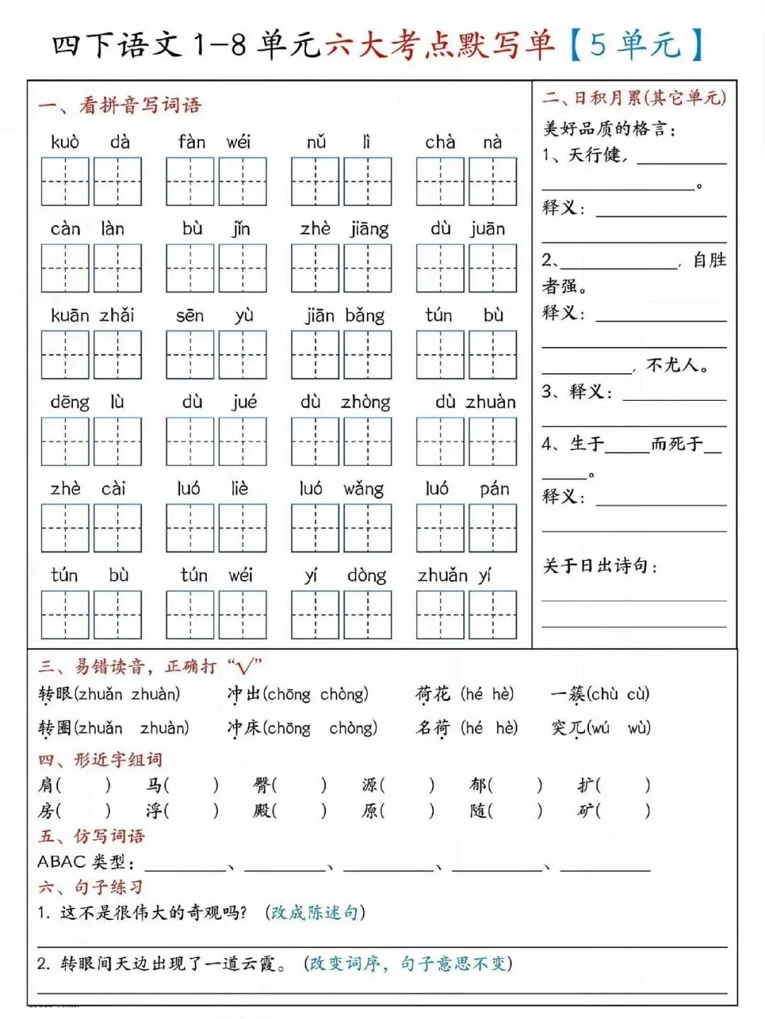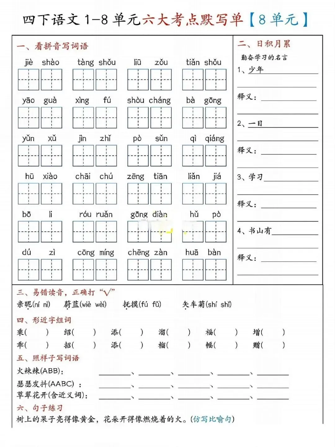 四年级下册语文1-8单元基础默写单,电子版可下载