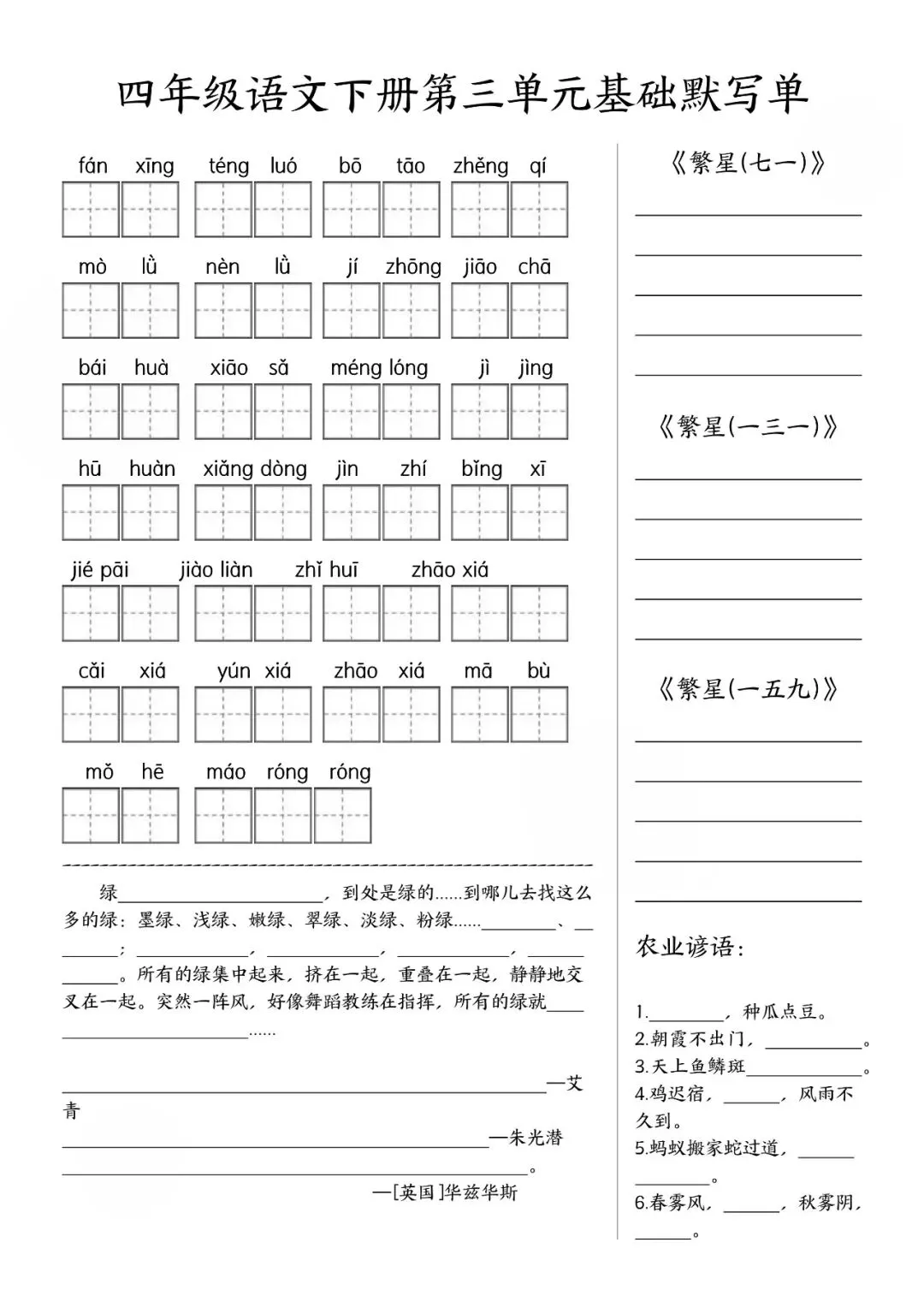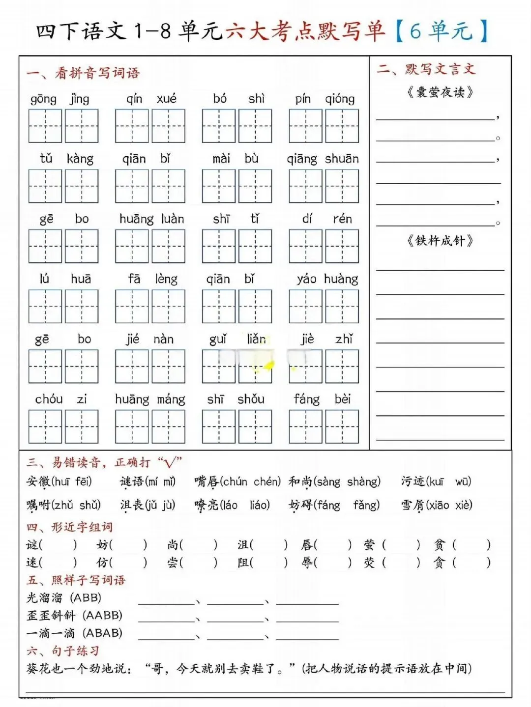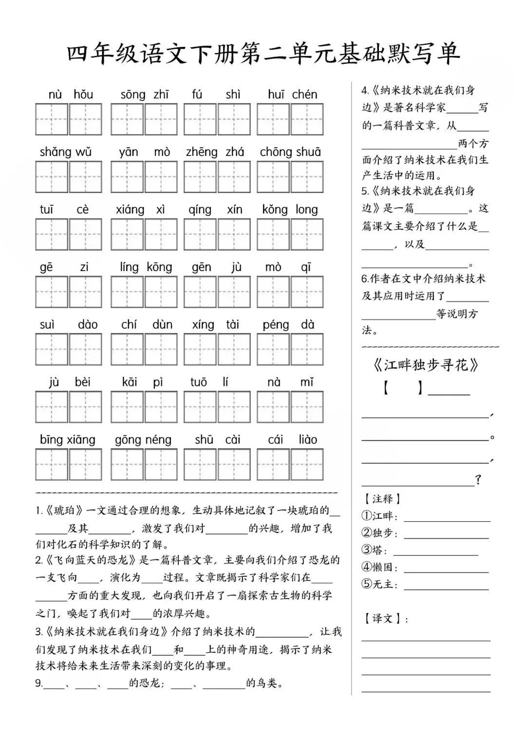 四年级下册语文1-8单元基础默写单,电子版可下载