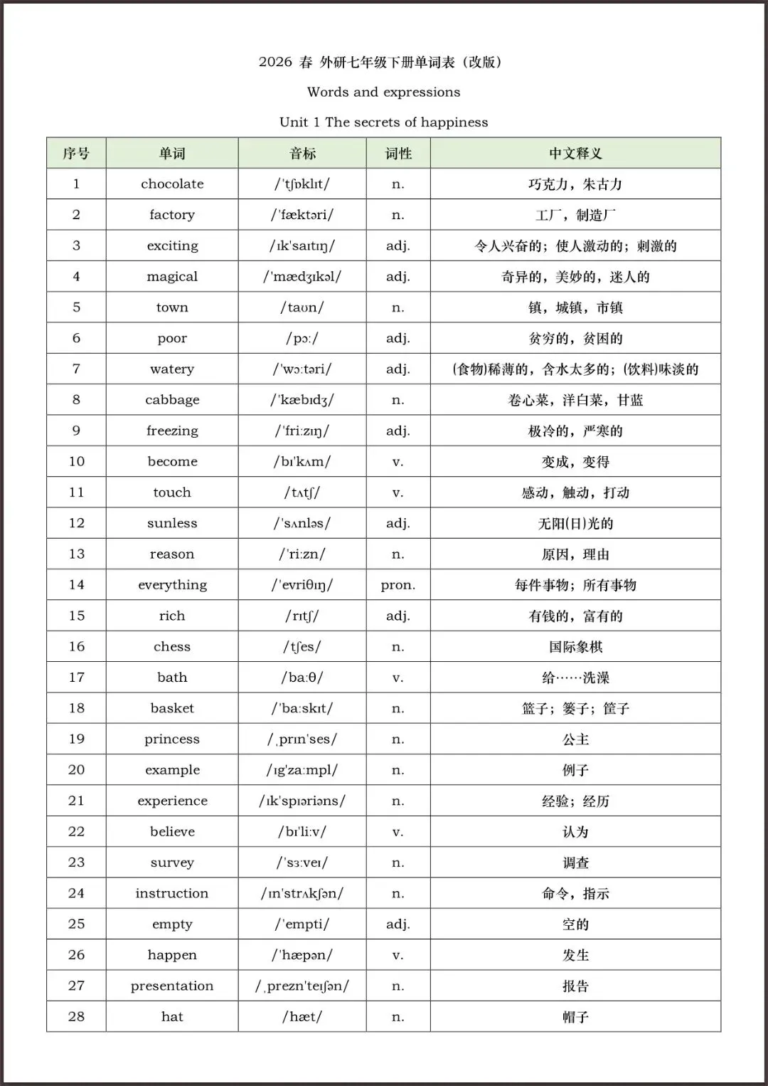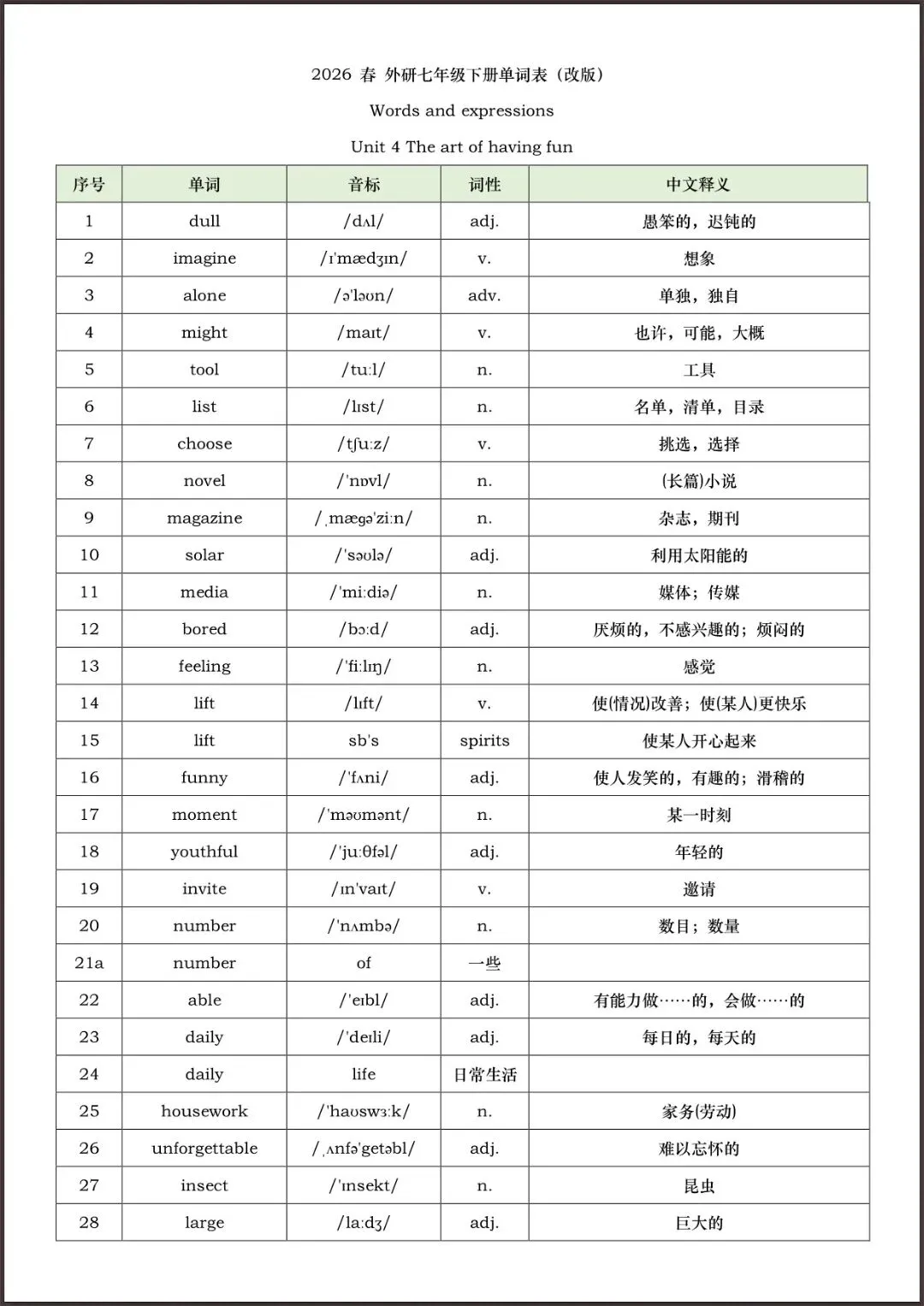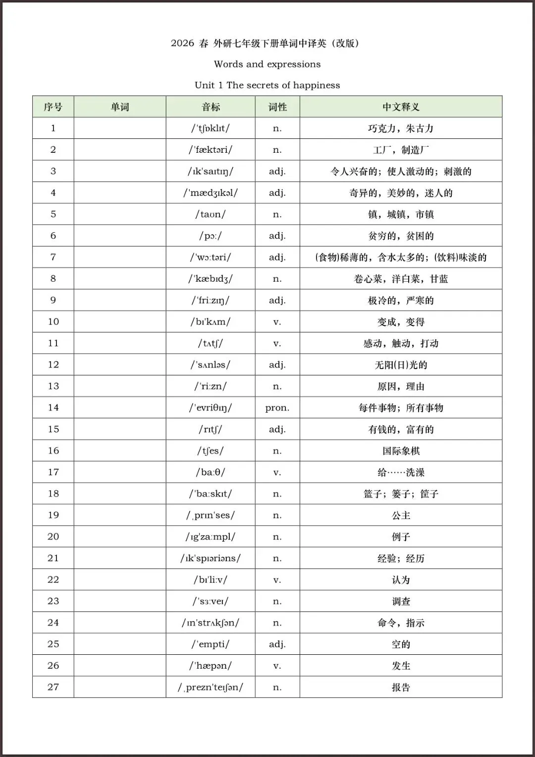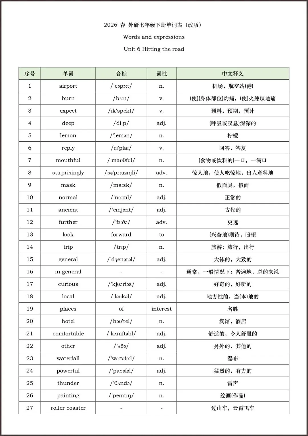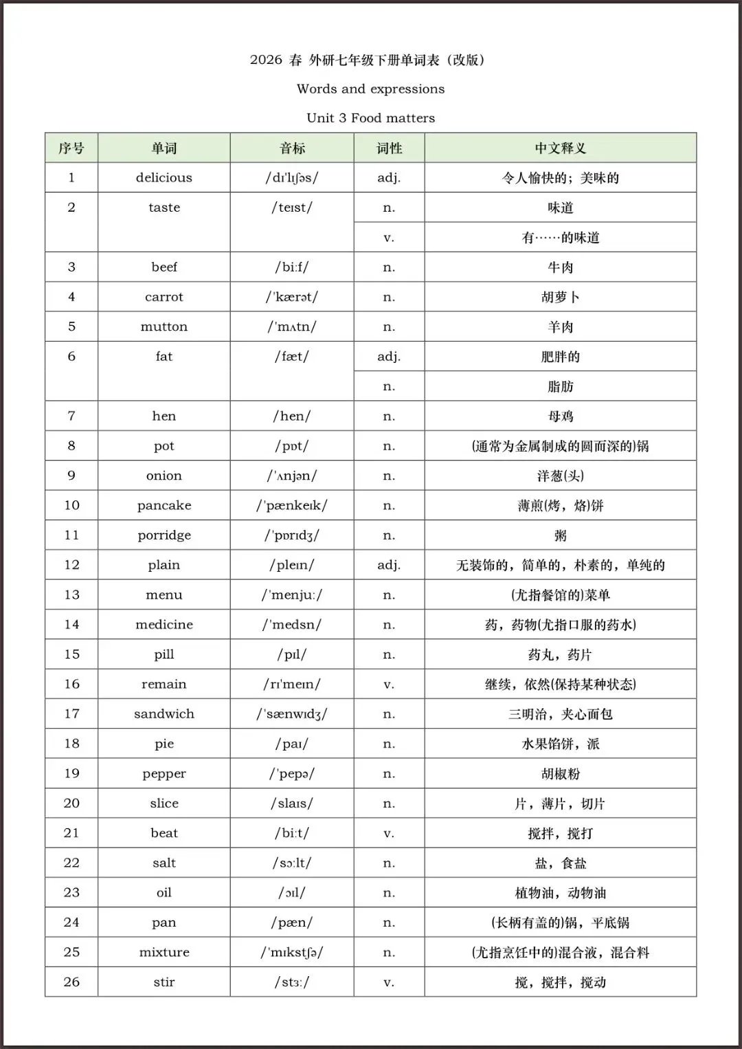 抢先预习|2026春新版教材【外研版】七年级下册英语全册(单词表+单词音频+单词默写英汉互译)电子版可下载打印