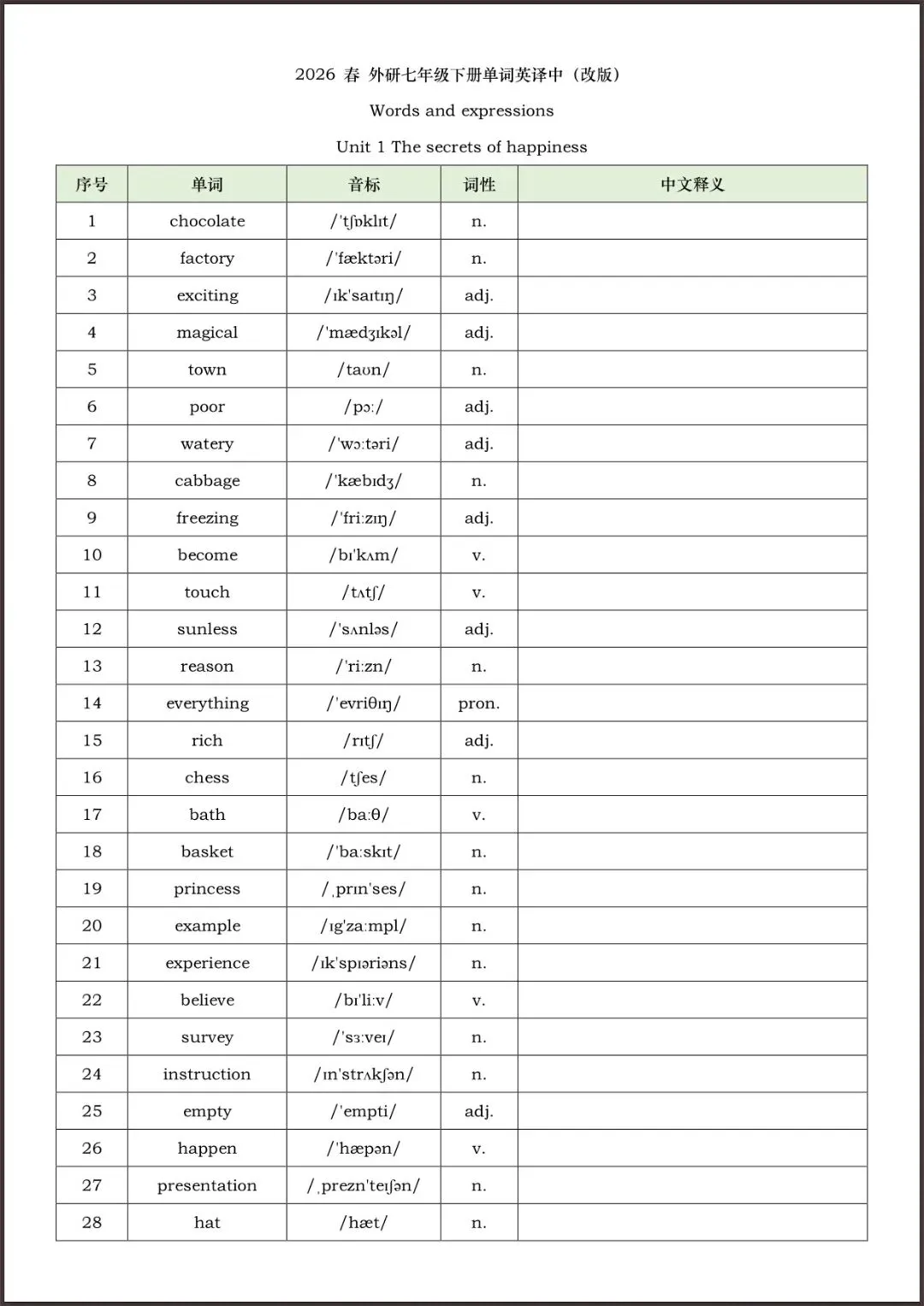抢先预习|2026春新版教材【外研版】七年级下册英语全册(单词表+单词音频+单词默写英汉互译)可下载打印