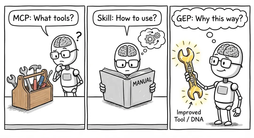 换句话说,MCP 让 Agent 「能做事」,Skill 让 Agent 「知道怎么做事」,GEP 进化层让 Agent 「越做越好,并且让所有 Agent 一起越做越好」。