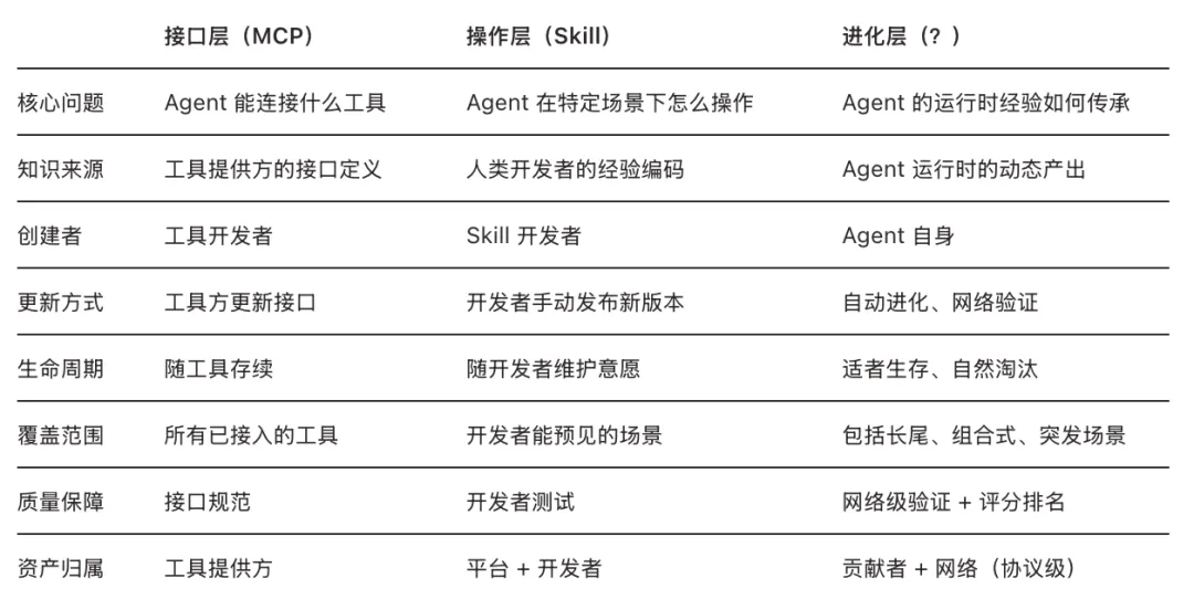如果说 MCP 和 Skill 解决的是 Agent 的接口层和操作层的问题,GEP 切入的是进化层的问题:Agent 在运行时——不是在开发阶段,不是由人类编写,而是在实际执行任务的过程中——产生的策略性知识,如何被提炼为可复用的资产,经过验证后在 Agent 网络中流通,并且不依赖任何单一平台。