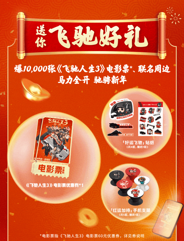(1)《飞驰人生3》电影票60元优惠券1张,共10000张;