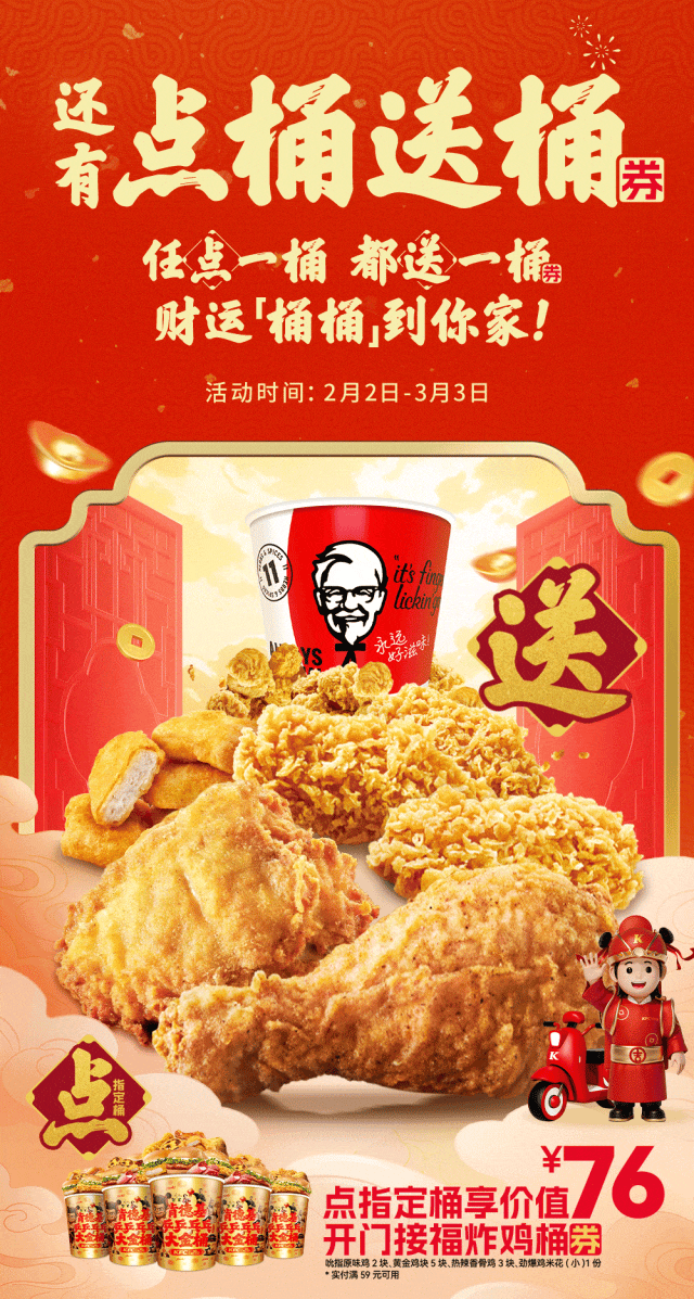 本活动自2026年02月02日至2026年03月03日,活动时间段9:30-23:00。活动期间,用户登录肯德基WOW会员后,在肯德基超级APP外送到家/肯德基宅急送微信小程序/肯德基宅急送支付宝小程序购买指定桶,可获领0元购开门接福炸鸡桶(实付满59元享,不含外送费和打包费)优惠券1张,请前往肯德基APP会员卡包查看并使用。0元购开门接福炸鸡桶(实付满59元享,不含外送费和打包费)优惠券将在订单送达后72小时内发放至用户的肯德基WOW会员“我的卡包”,自领取起5小时后生效,自领取之日起14天内使用有效。每张优惠券仅限使用一次,核销后即失效。活动地区:全国。电子券具体使用规则详见“我的卡包”券说明。同一用户就本活动电子券每张仅限领取1次。每单仅限使用一张优惠券。电商团购券核销单不参与本活动。同一ID、同一设备、同一手机号、同一支付账户、同一取餐联系电话、同一送餐联系电话、同一送餐地址,均视为同一用户。对于任何通过不正当手段(包括但不限于作弊、通过机器行为等方式恶意刷单)参加活动获取权益或者不符合活动规则的行为,我们将在不事先通知的前提下取消该用户参与活动的资格和已获得的相应权益。外送部分送餐区域不供应本产品,详情以输入地址后显示的菜单及送餐时间为准,外送费及打包服务费需自理。除推广产品外,其他物品仅做装饰目的,图示内容仅供参考。产品、周边、玩具及包装以实物为准。不与其他优惠共享。堂食、肯德基宅急送自有渠道、第三方外卖平台外送渠道、甜品站、团购渠道、企业送渠道以及其他渠道的产品组合、价格以及优惠活动,以各渠道页面展示为准。