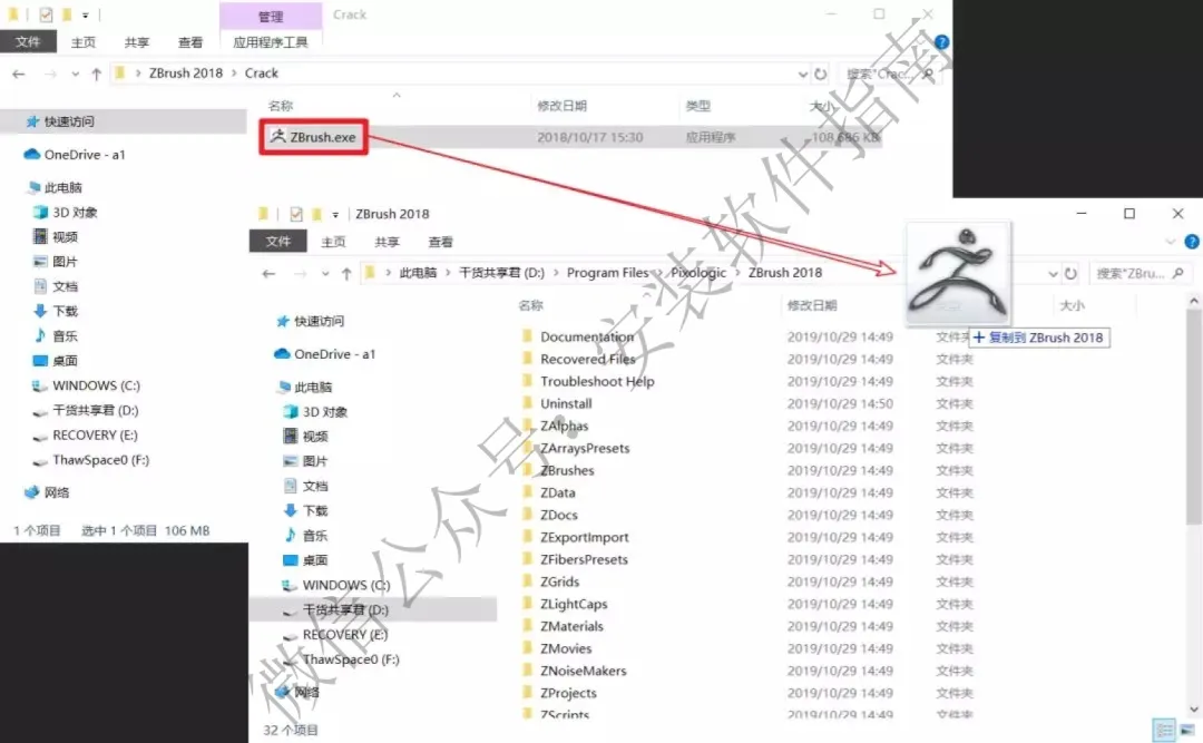 11.将Crack里面的激活补丁复制粘贴到我们第6步选择的安装目录即D:\Program Files\Pixologic\ZBrush 2018