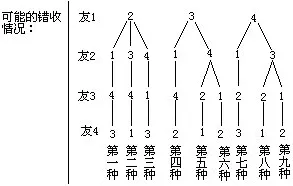 说明:如第一种错收情况是友1得2号信,友2得了1号信,友3得了4号信,友4得了3号信。