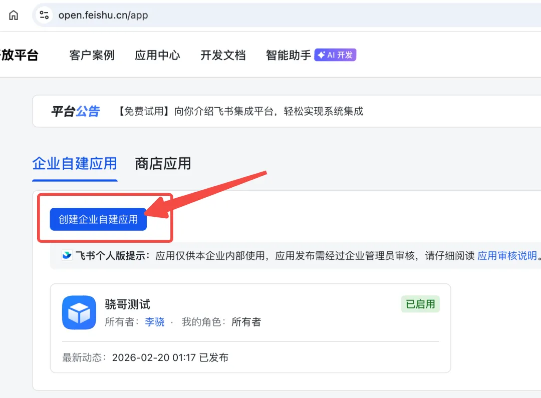 首先去这个地址👉open.feishu.cn/app,「创建企业自建应用」