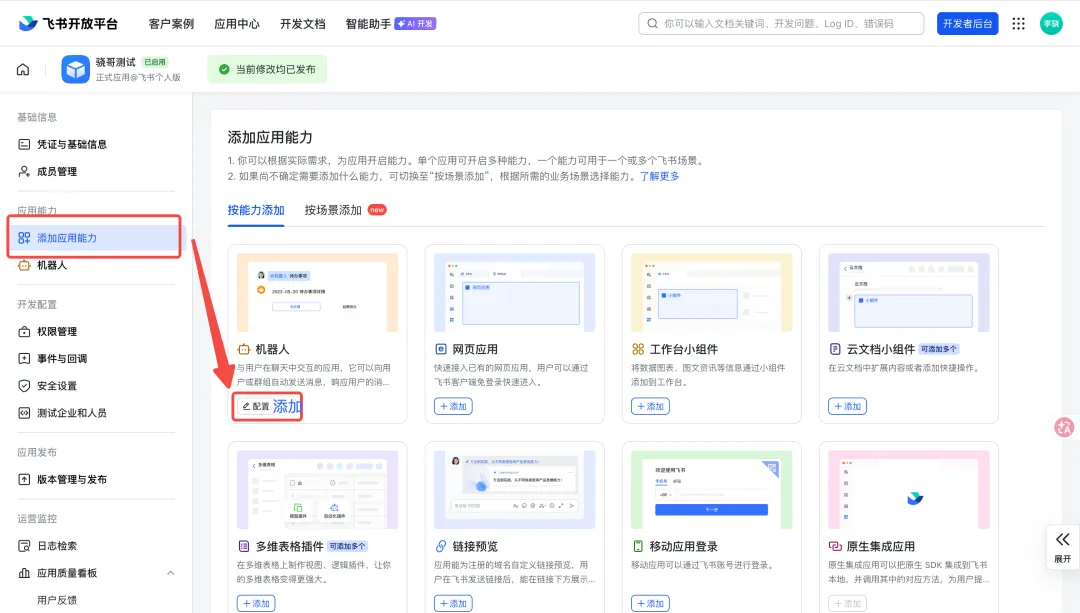 菜单「添加应用能力」,然后点击「+添加」机器人。成功后,🤖机器人会出现在左侧菜单里✅