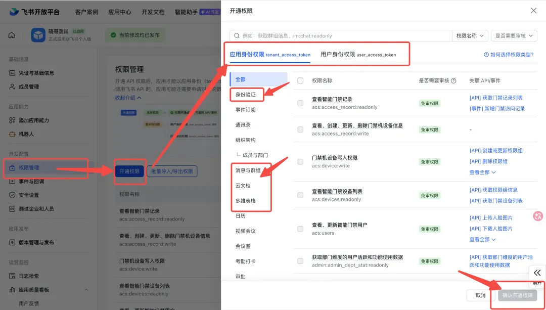 然后把“身份验证”、“消息群组”、“云文档”、“多维表格”下的所有权限,有一个算一个,全选上✅